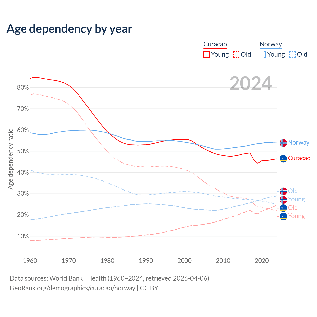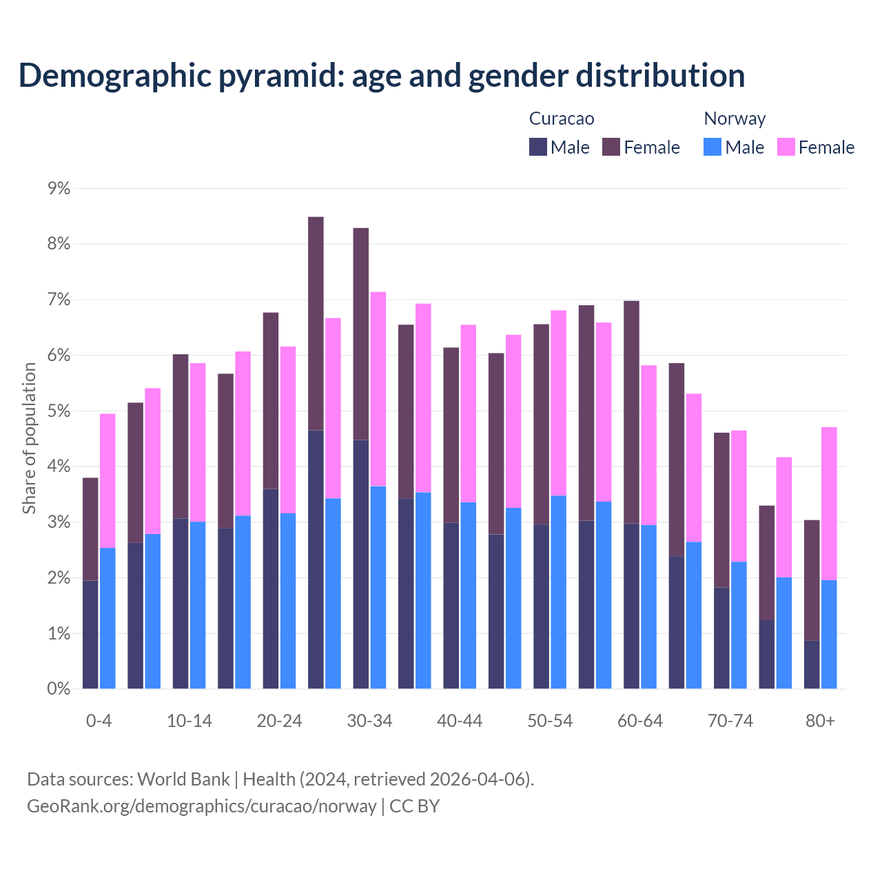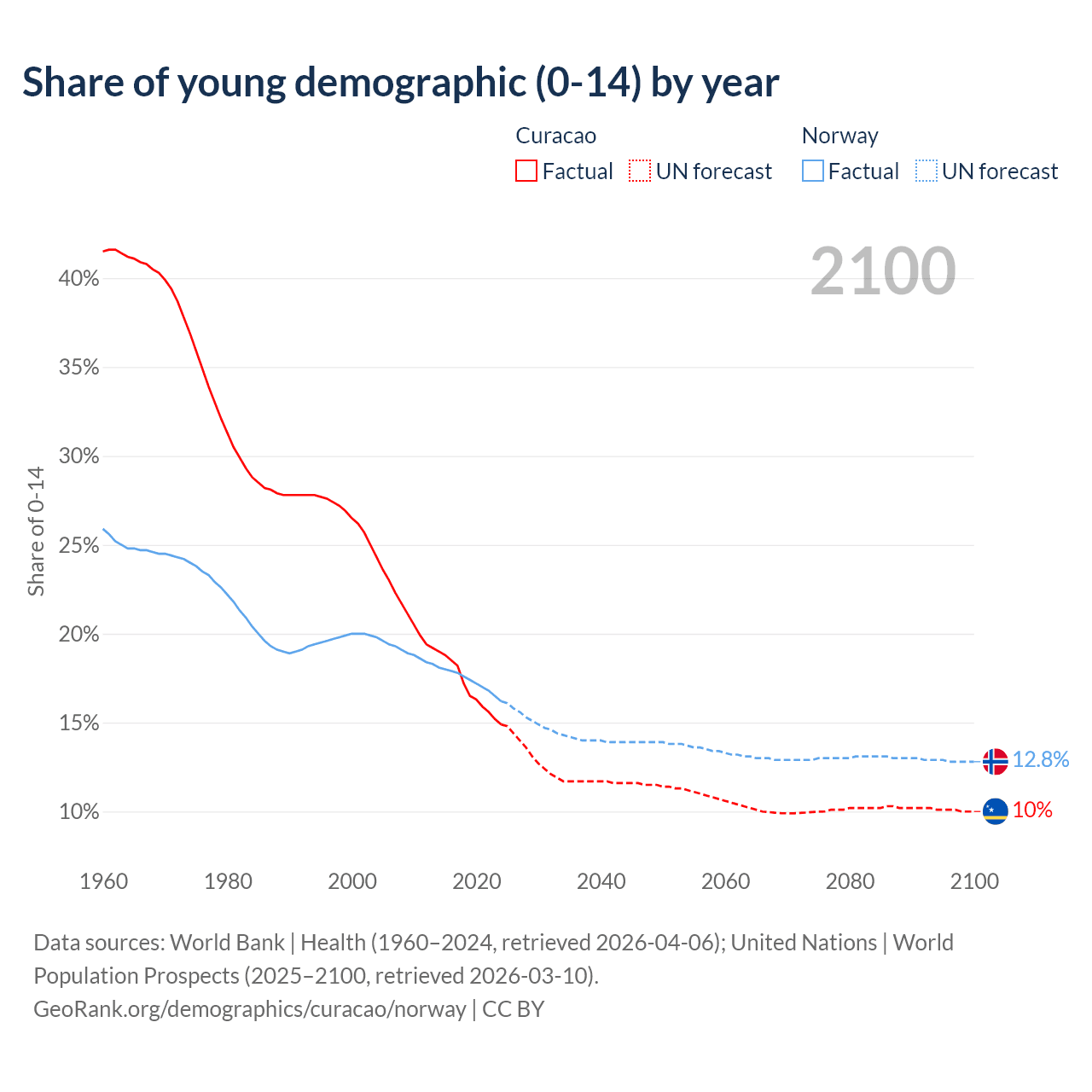 - The share of young demographic (0-15 years old) in Curacao is 14.9% vs 16.2% in Norway.