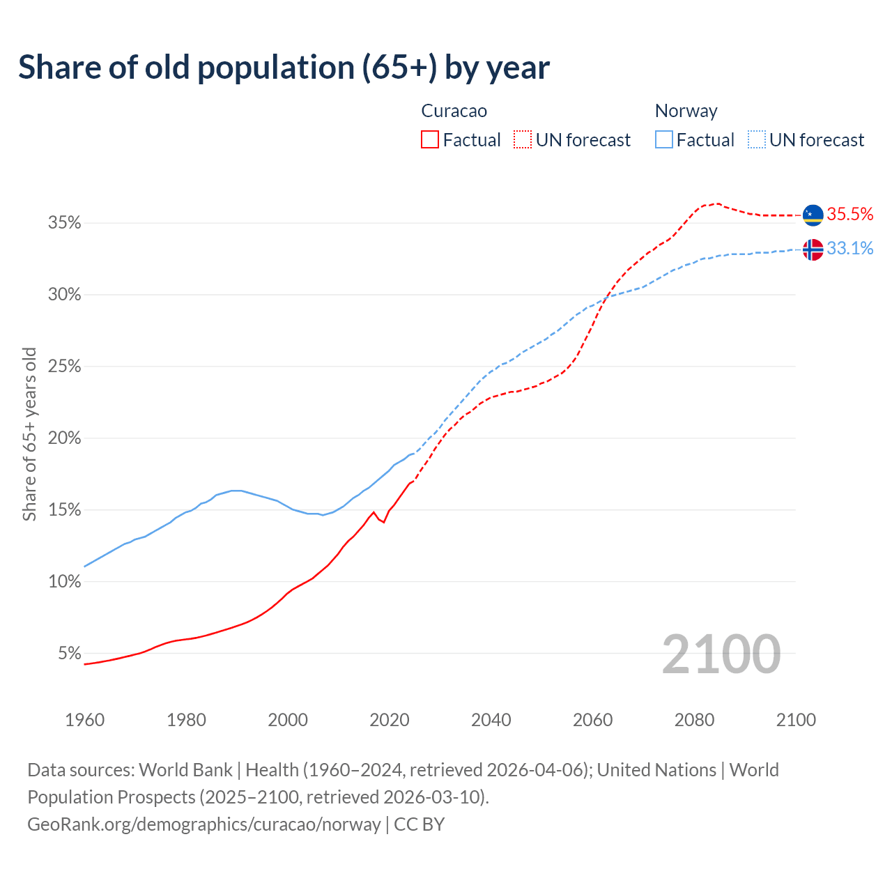 - The share of old-age demographic (65+) in Curacao is 16.8% vs 18.8% in Norway.