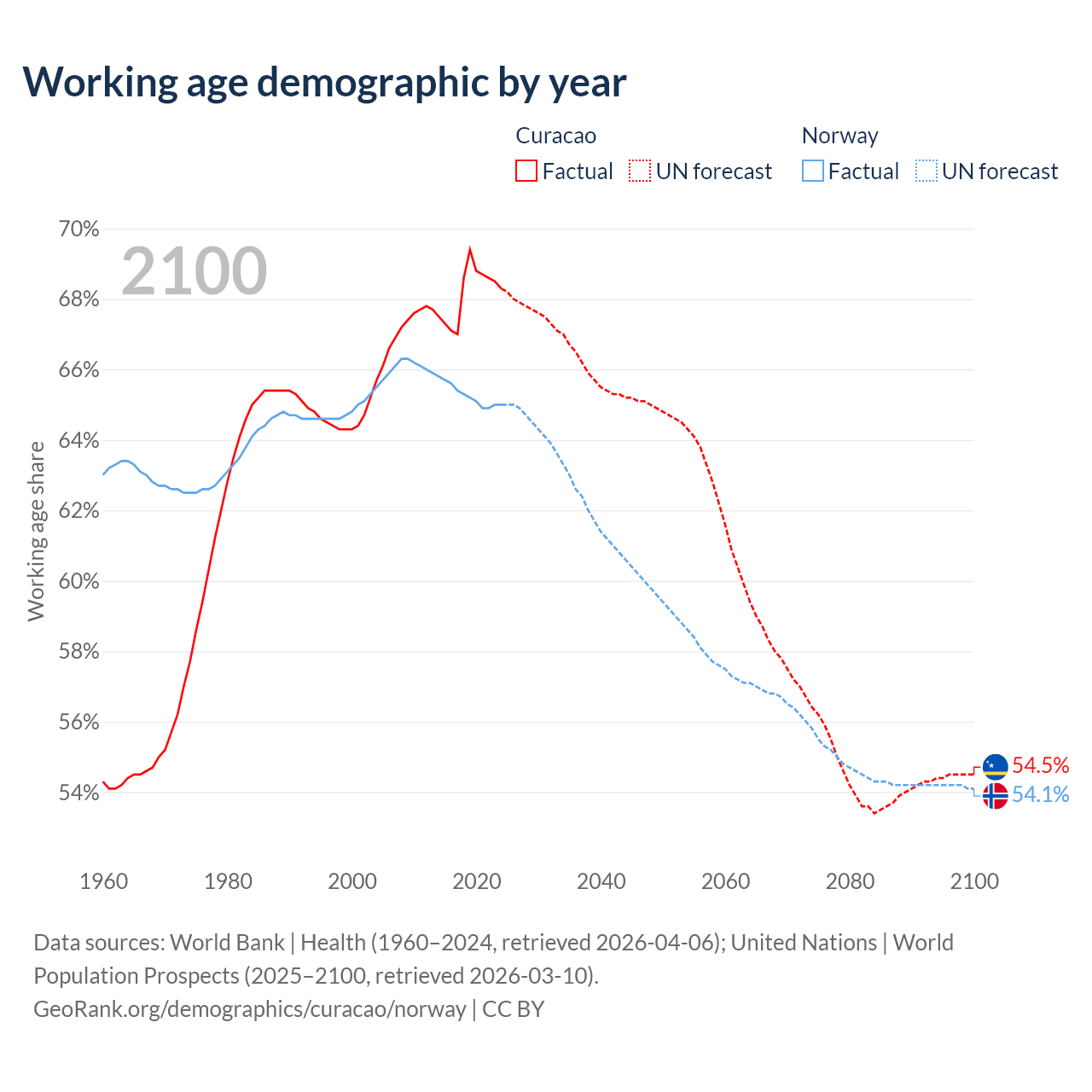 - Curacao has 107K working age adults (aged 15-64) vs 3.69M in Norway.