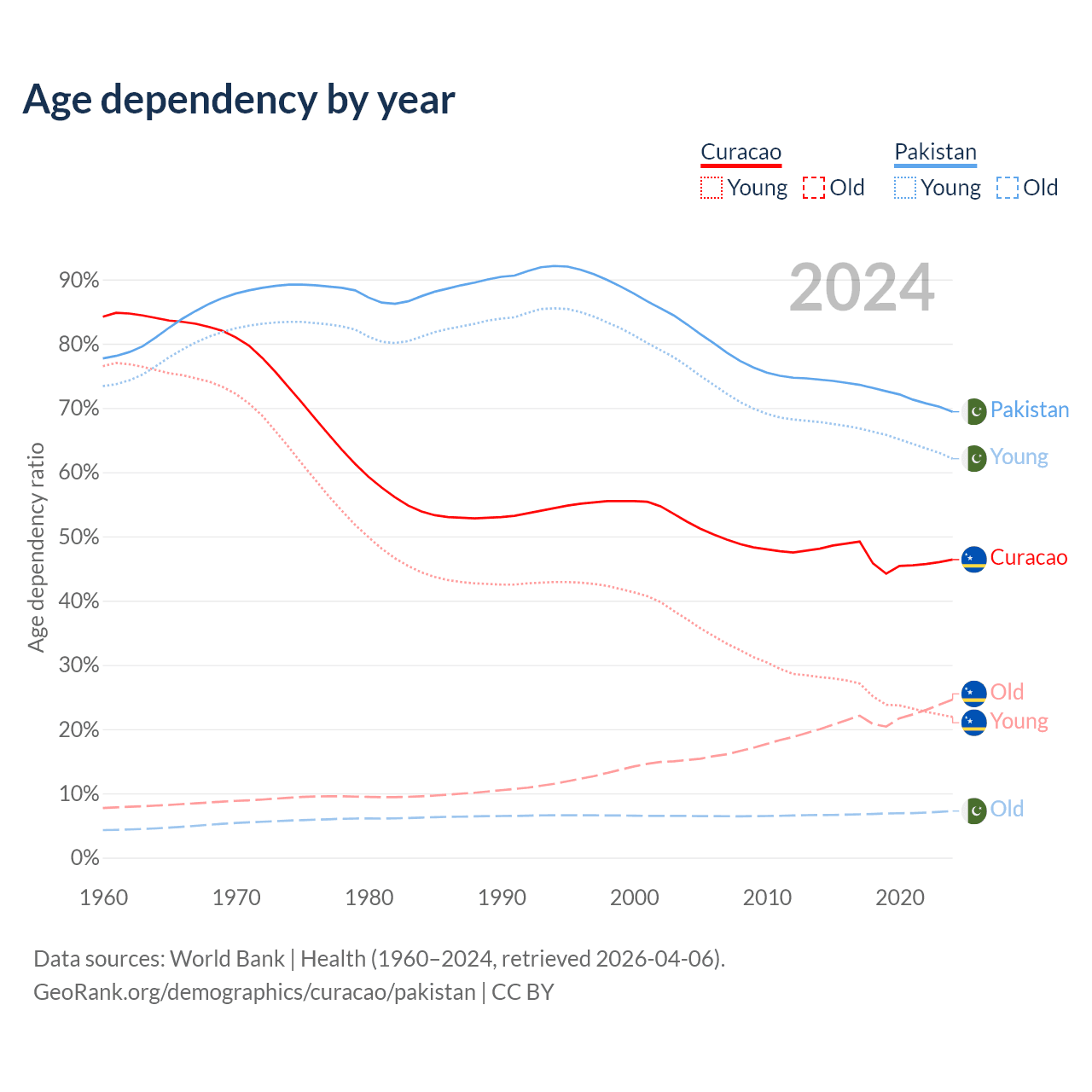 - The share of old-age demographic (65+) in Curacao is 16.8% vs 4.28% in Pakistan.