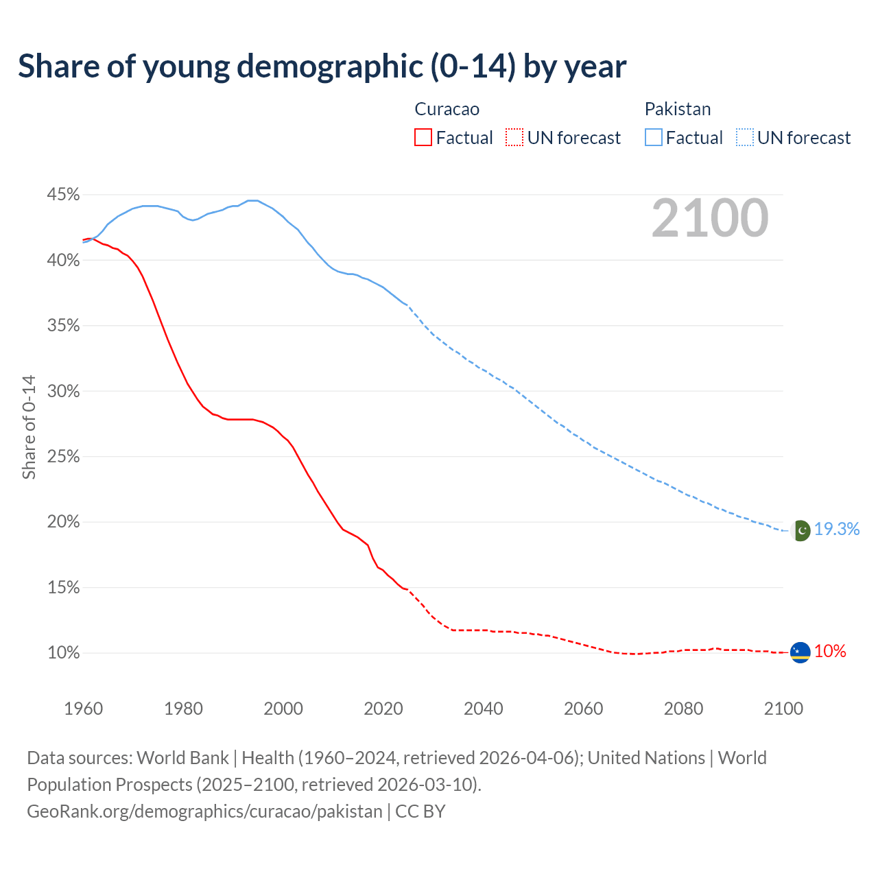 - The share of young demographic (0-15 years old) in Curacao is 14.9% vs 36.7% in Pakistan.