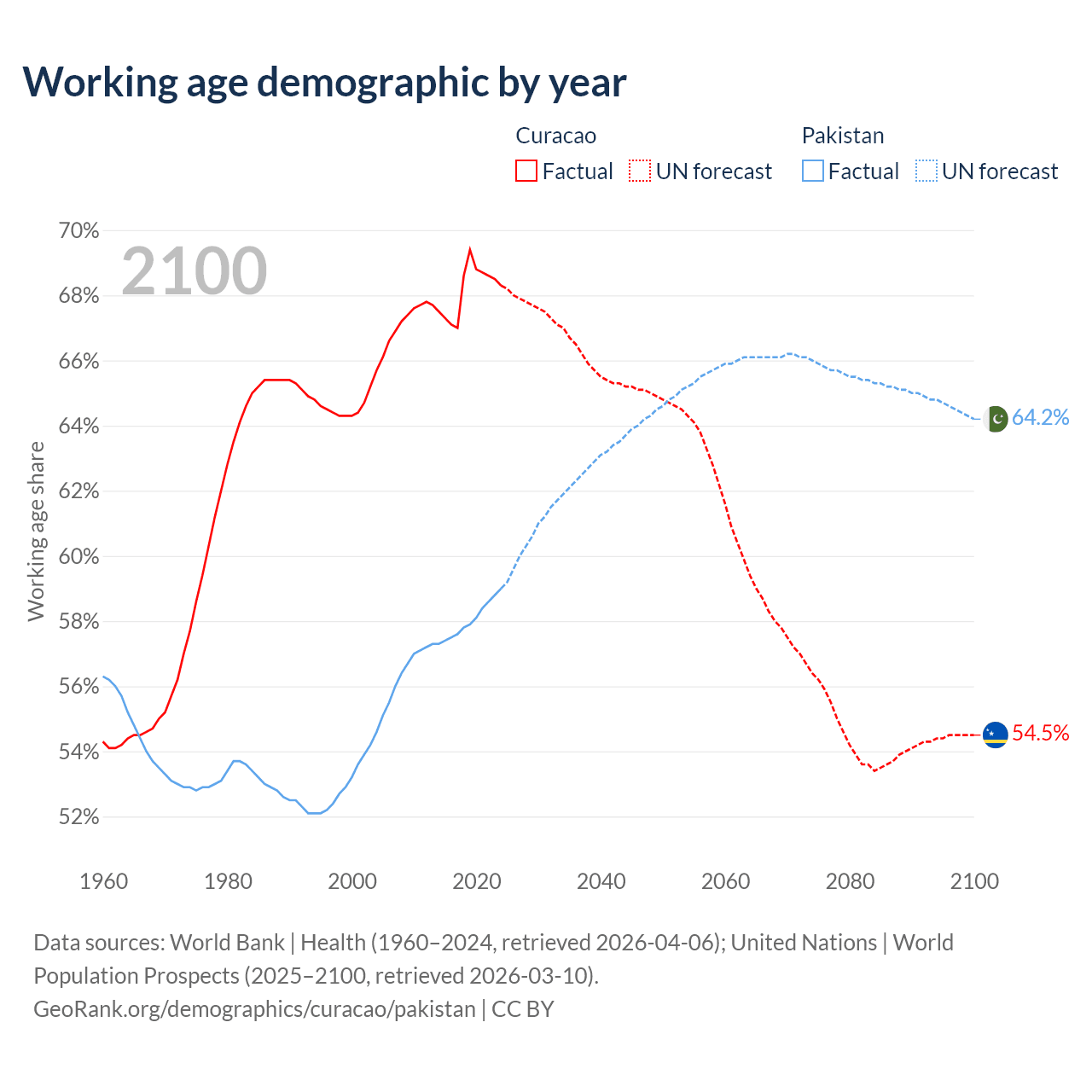 - Curacao has 107K working age adults (aged 15-64) vs 154M in Pakistan.