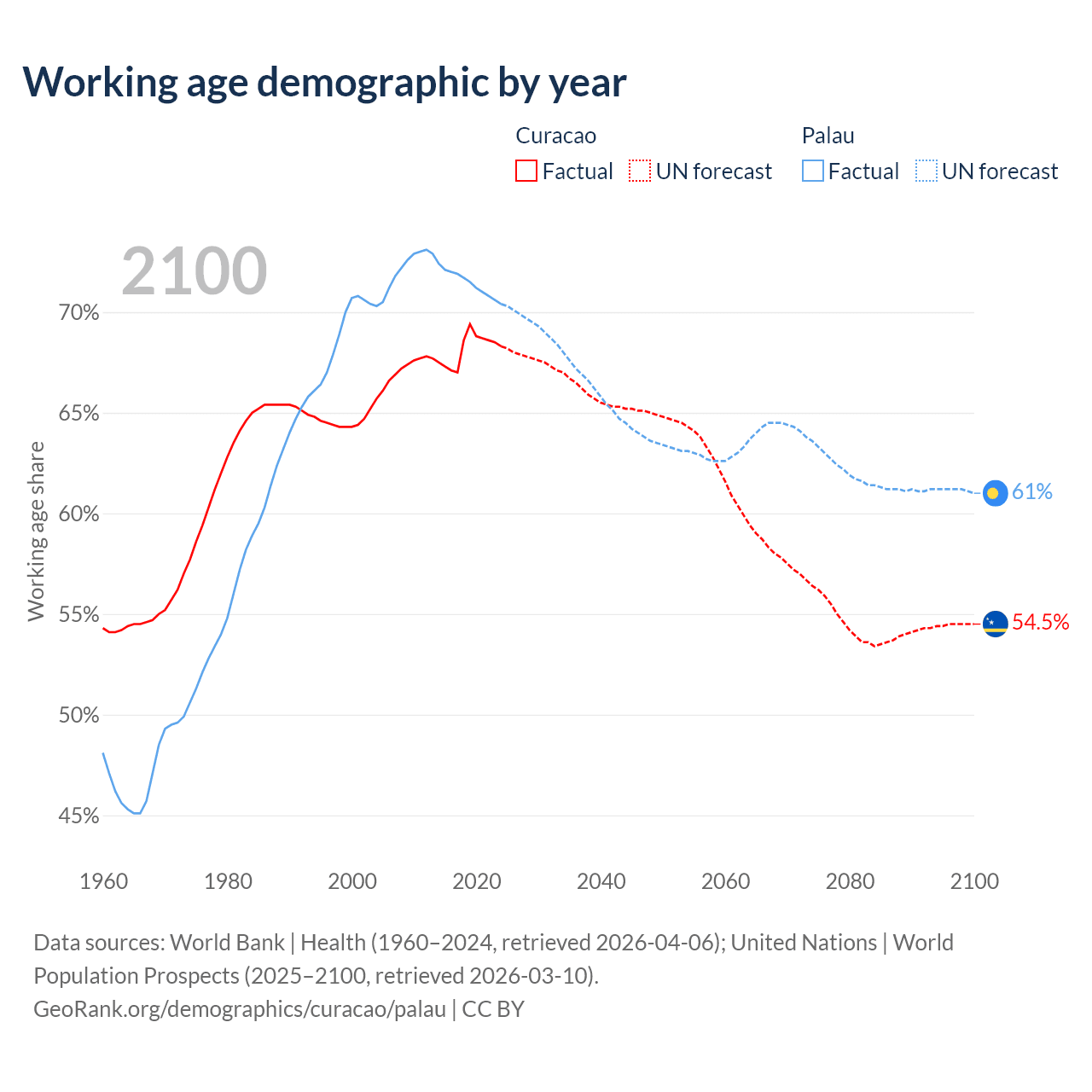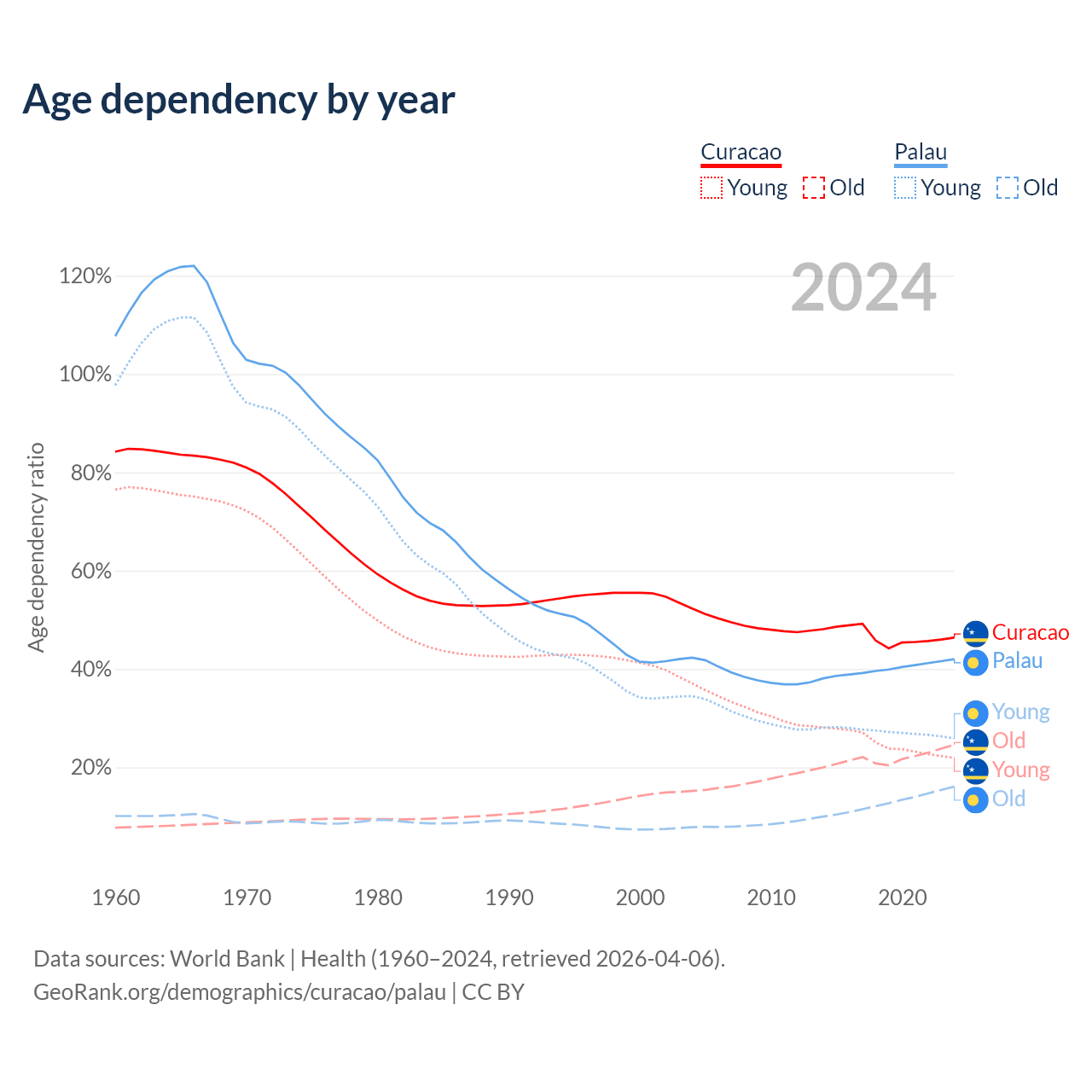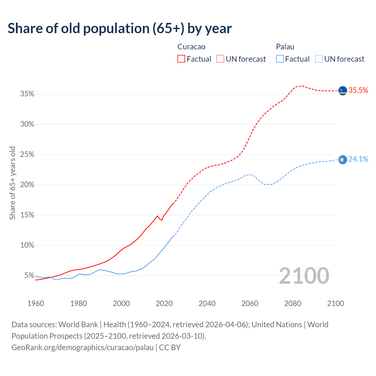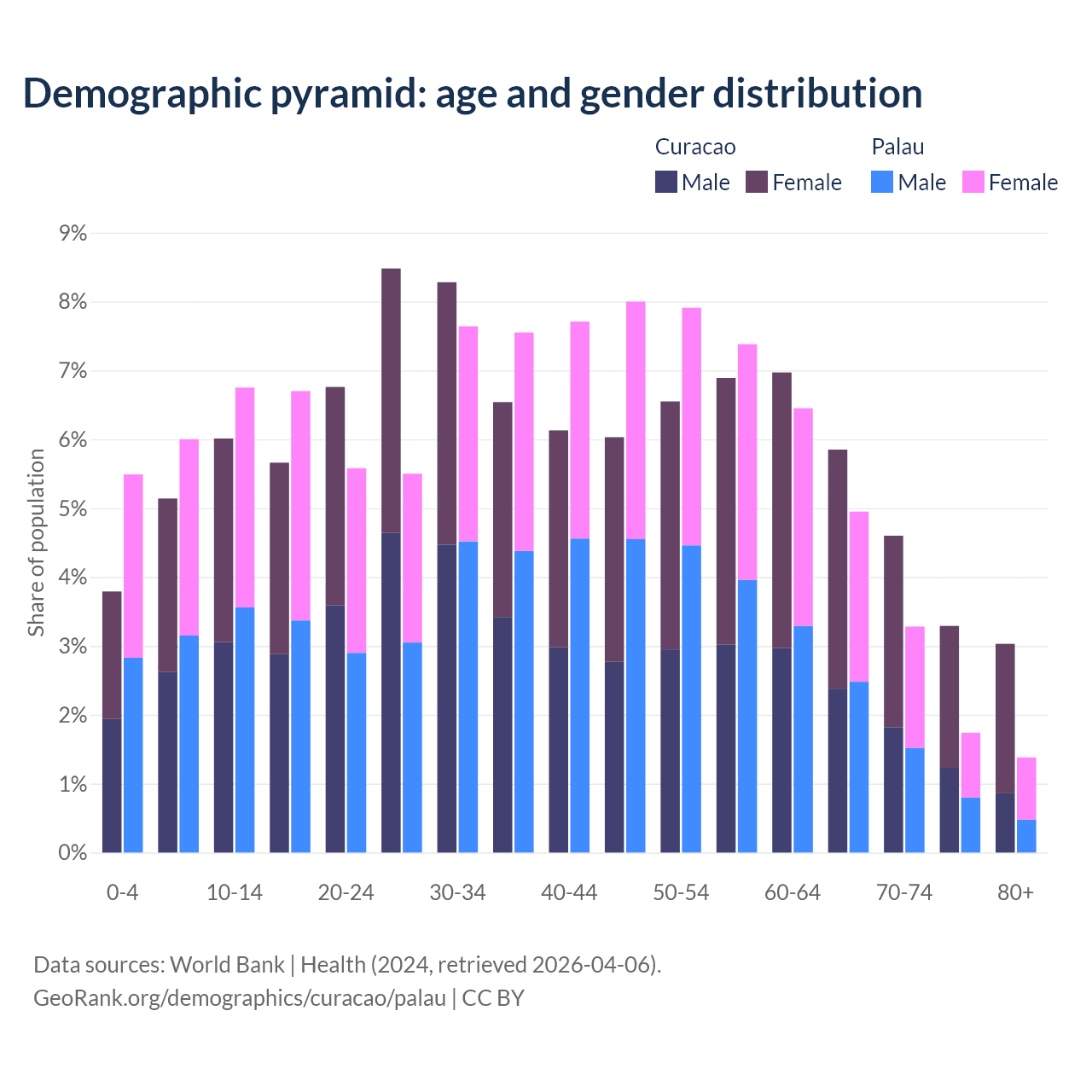 - The share of old-age demographic (65+) in Curacao is 16.8% vs 11.3% in Palau.