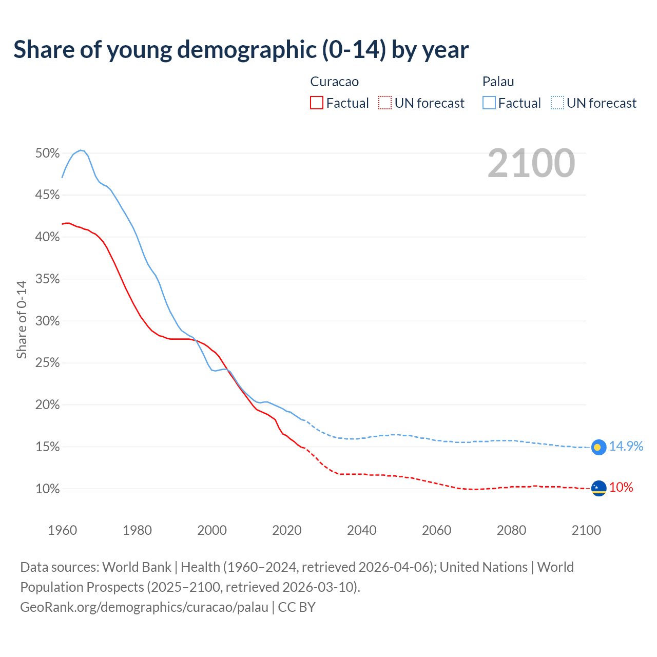 - The share of young demographic (0-15 years old) in Curacao is 14.9% vs 18.2% in Palau.
