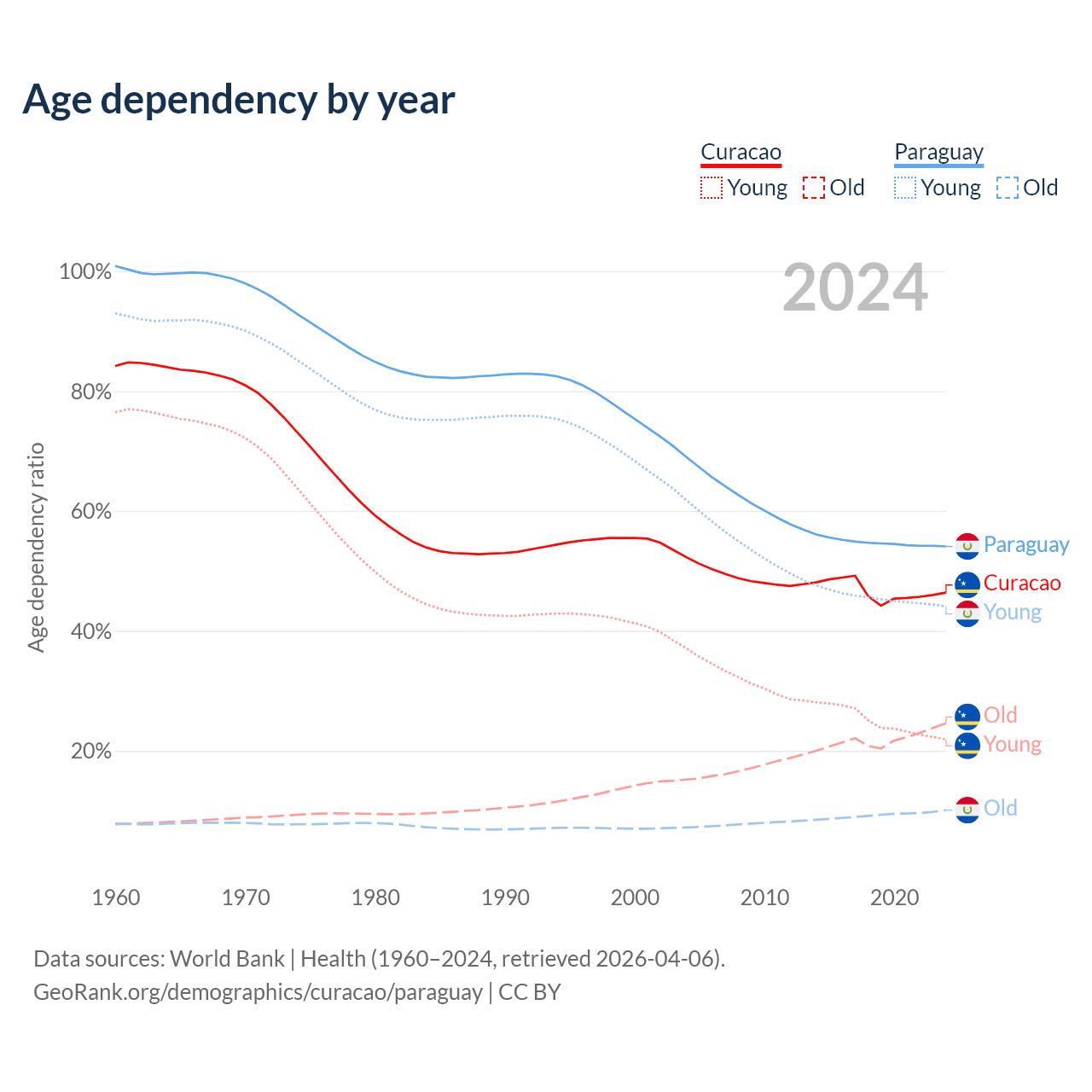 - Curacao is ranked 49/196 by median age (oldest to youngest) vs 118/196 for Paraguay.