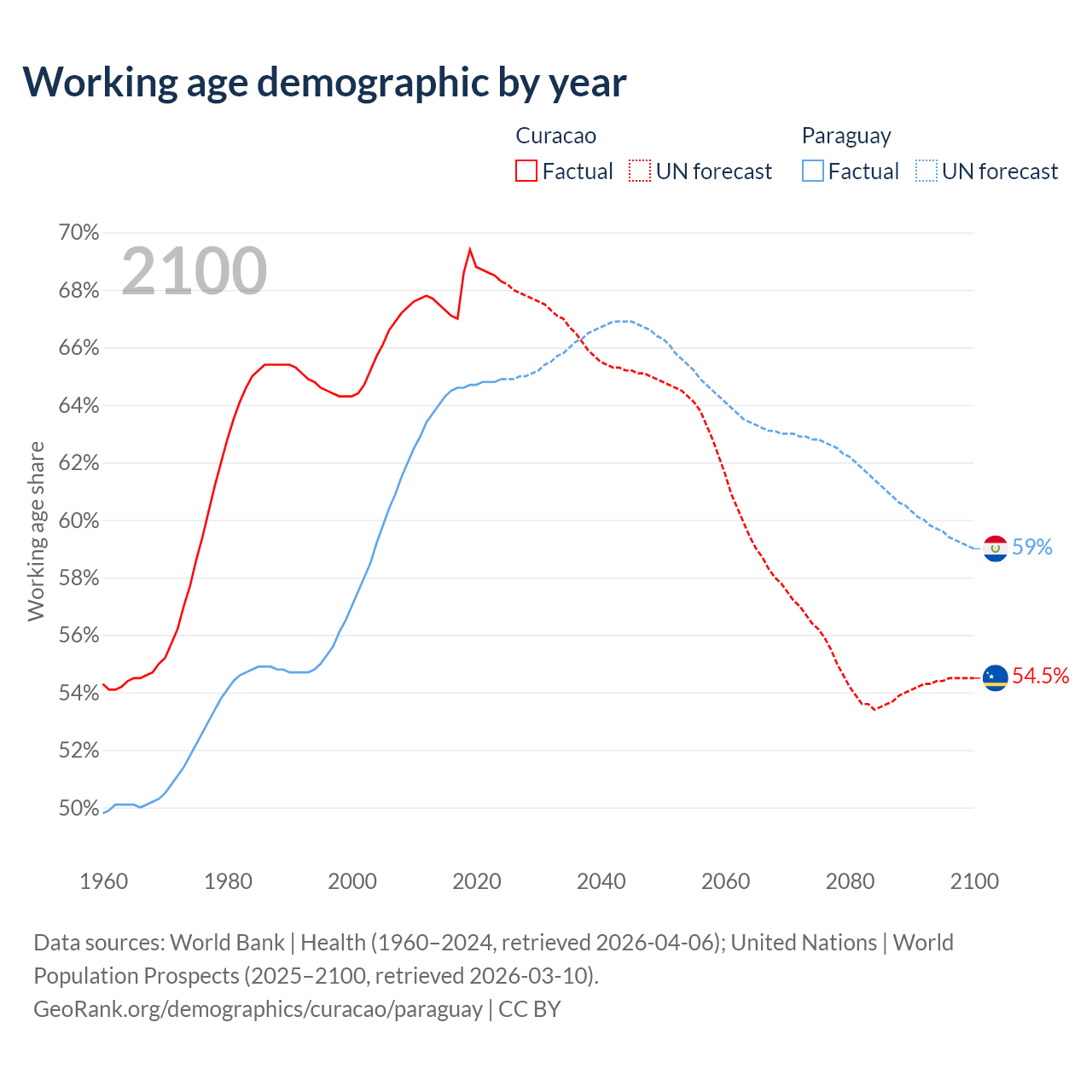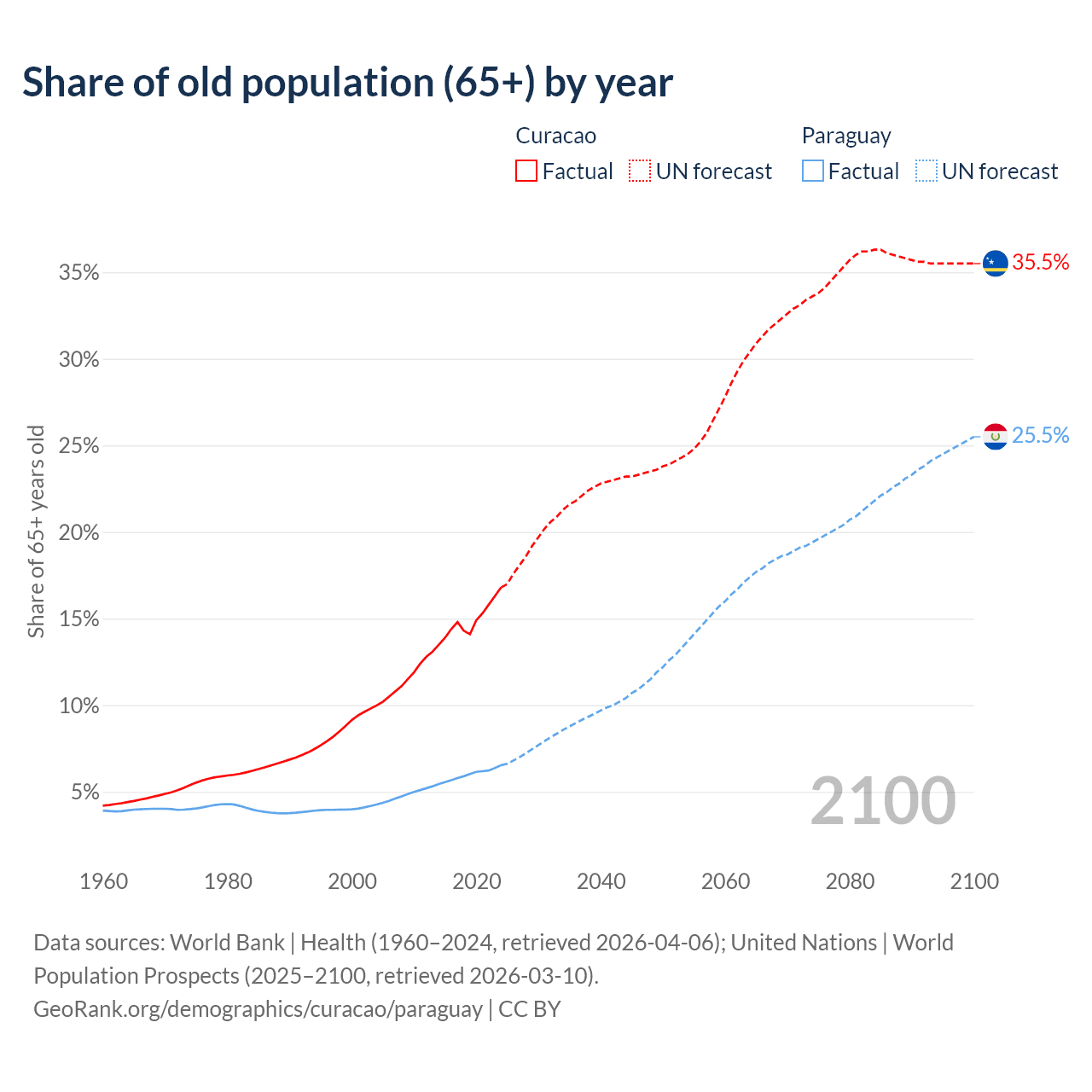 - The share of old-age demographic (65+) in Curacao is 16.8% vs 6.54% in Paraguay.