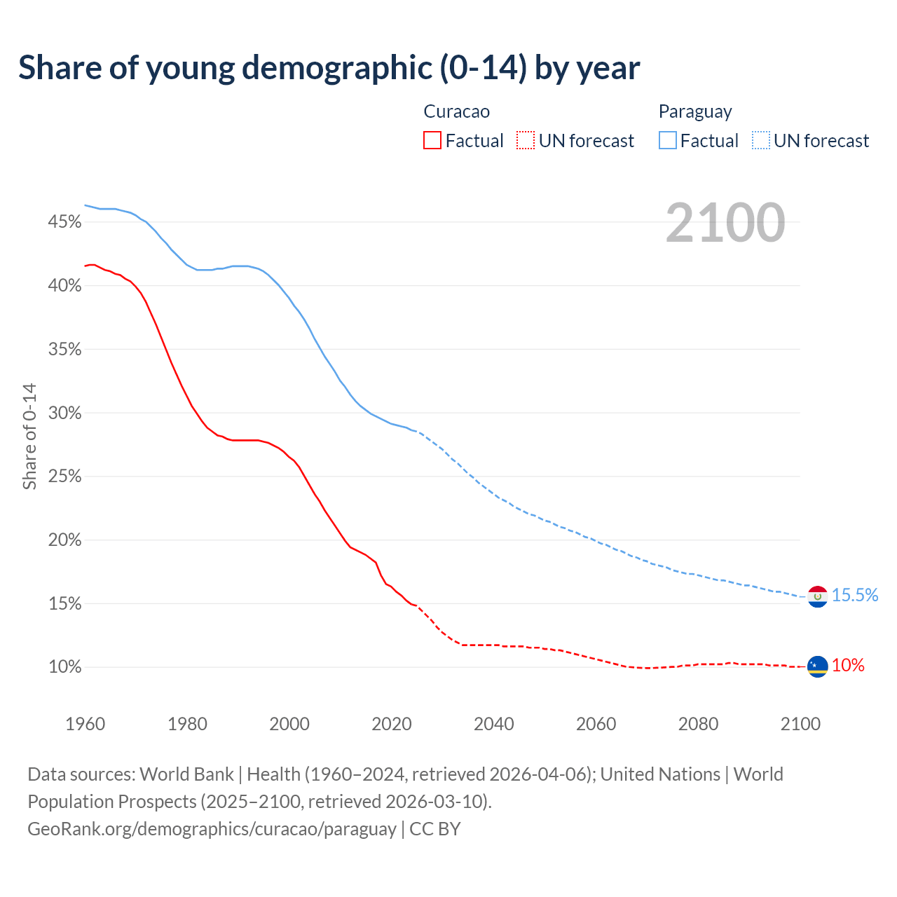 - The share of young demographic (0-15 years old) in Curacao is 14.9% vs 28.6% in Paraguay.