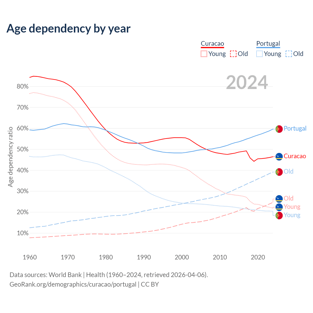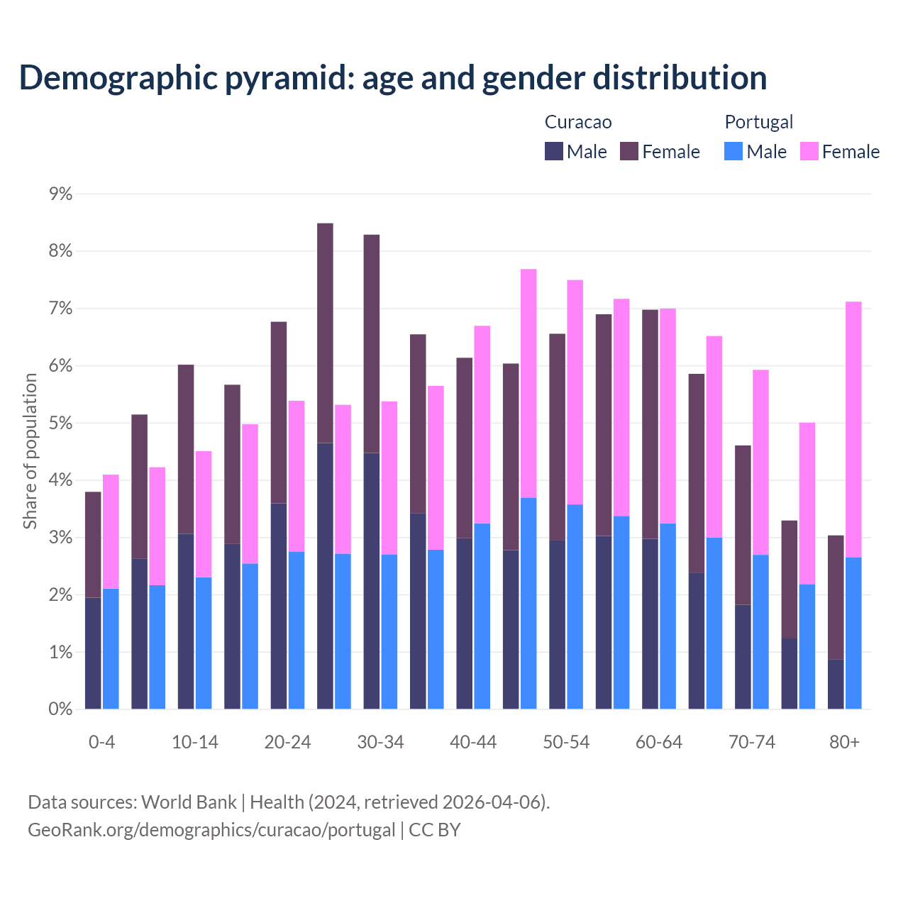 - Curacao is ranked 49/196 by median age (oldest to youngest) vs 5/196 for Portugal.