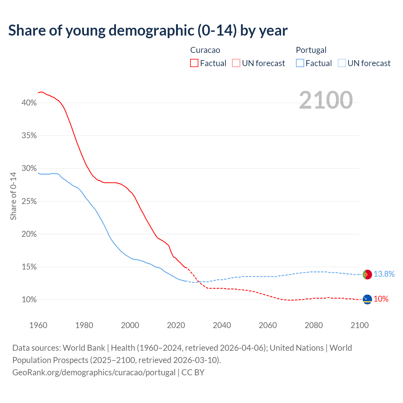 - The share of young demographic (0-15 years old) in Curacao is 14.9% vs 12.8% in Portugal.