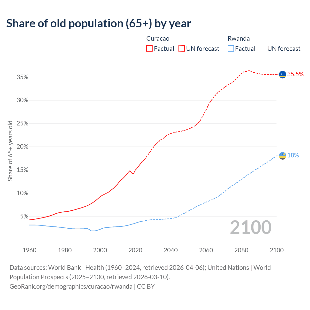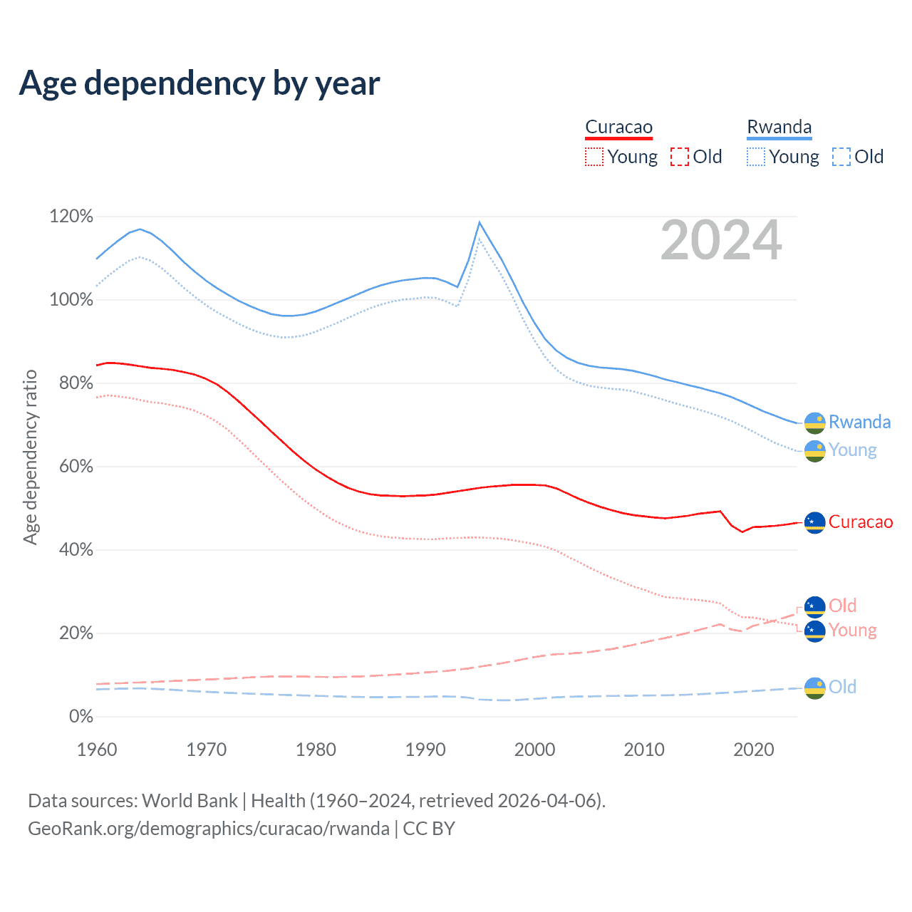 - The share of old-age demographic (65+) in Curacao is 16.8% vs 3.93% in Rwanda.