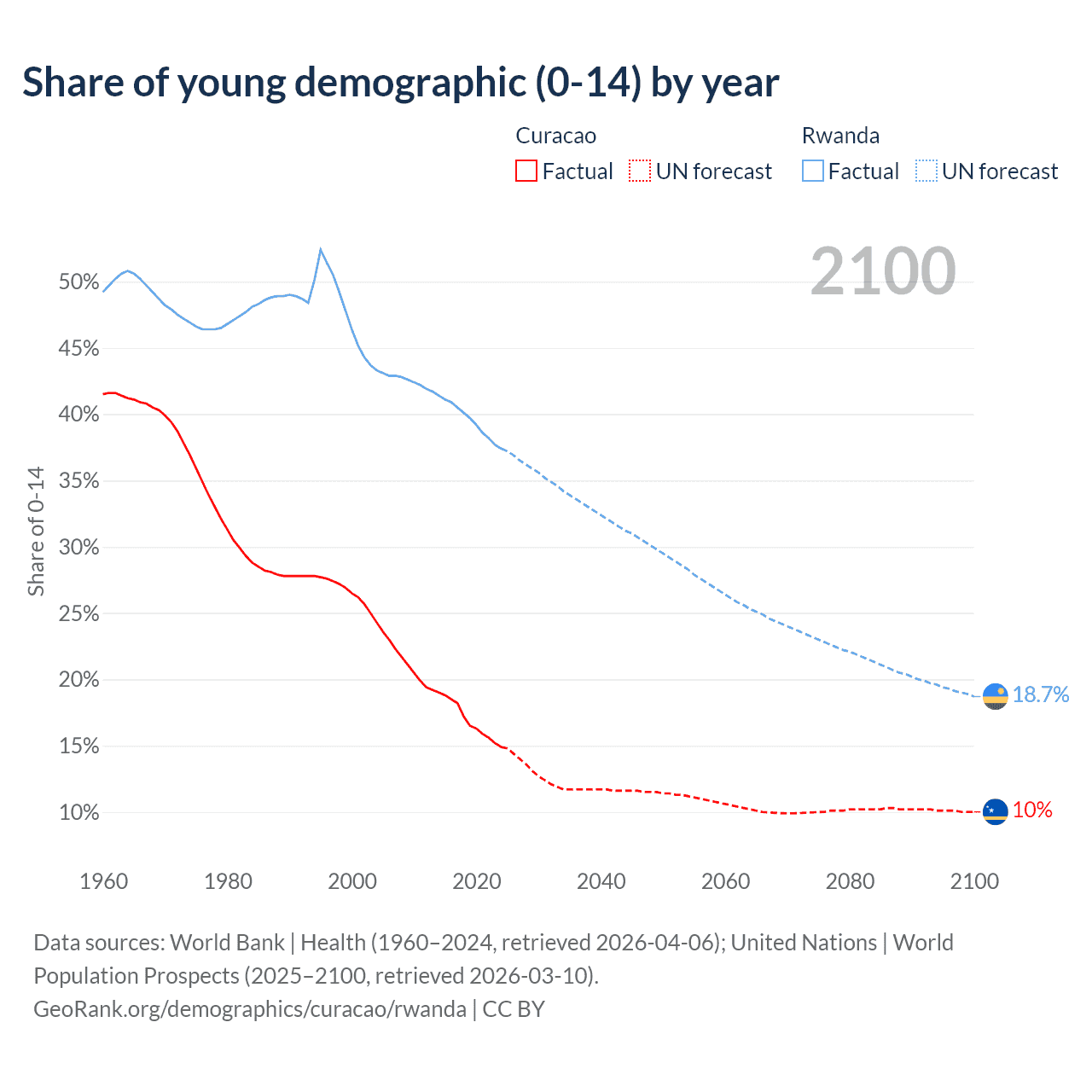 - The share of young demographic (0-15 years old) in Curacao is 14.9% vs 37.4% in Rwanda.