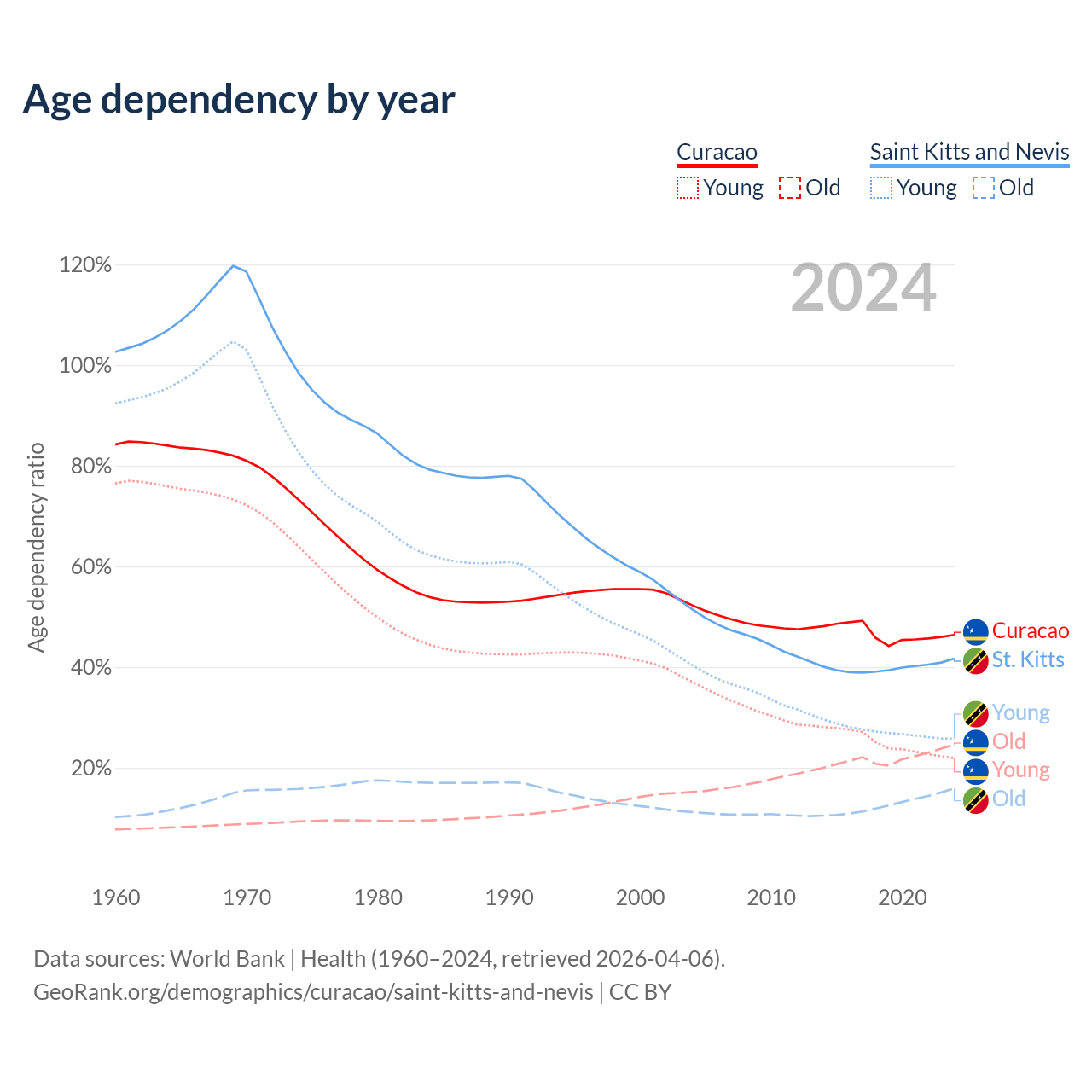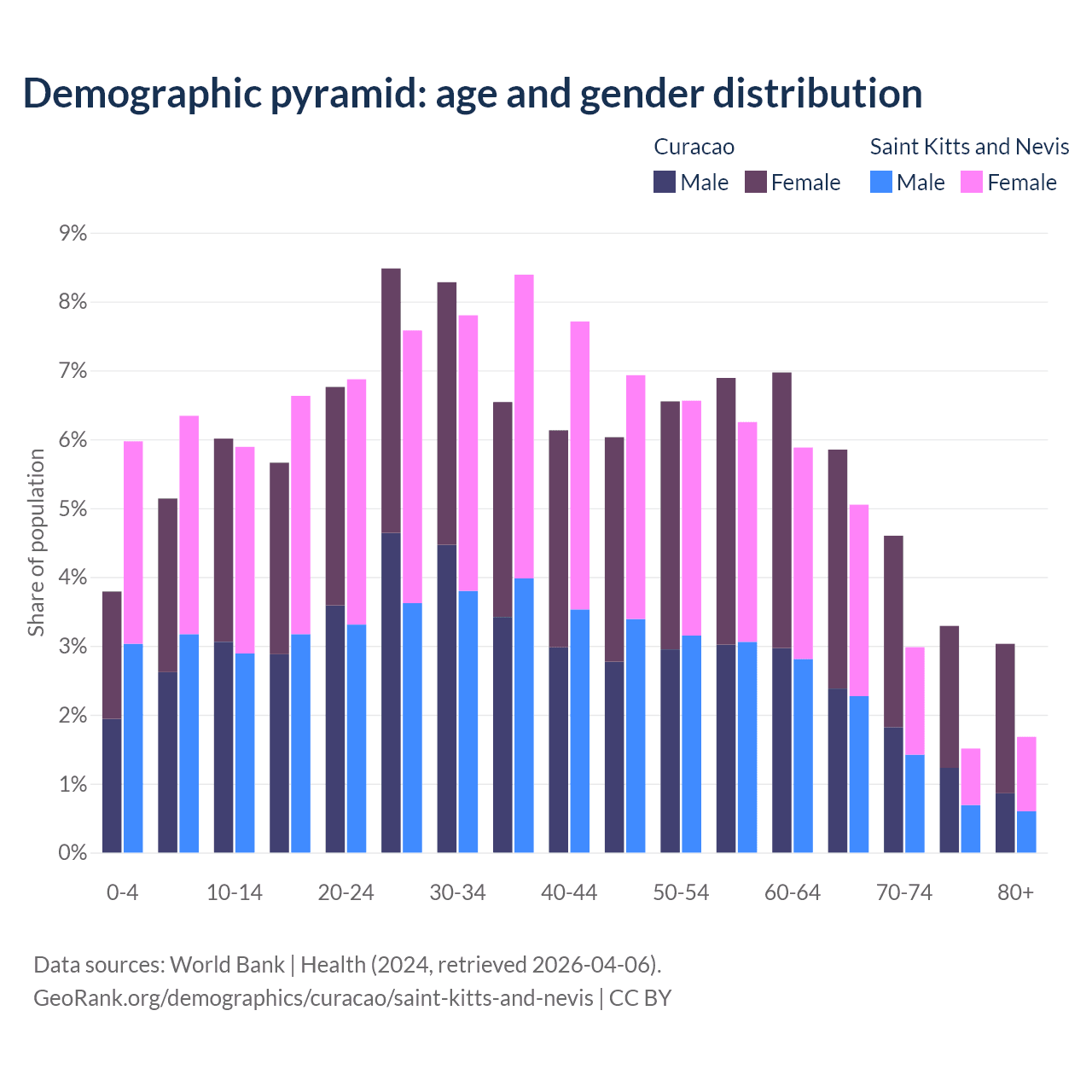 - The share of old-age demographic (65+) in Curacao is 16.8% vs 11.2% in Saint Kitts and Nevis.