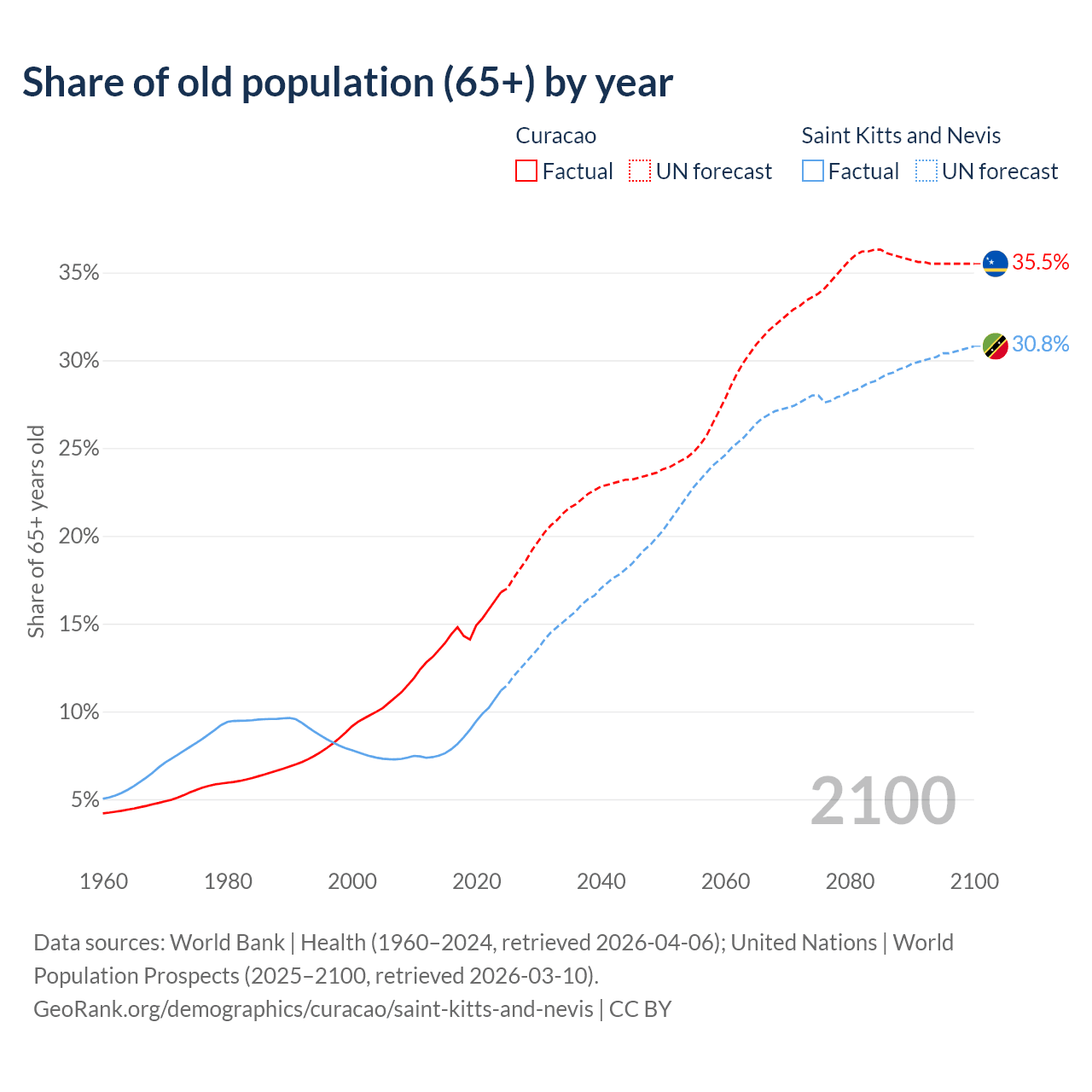 The share of older people aged 65 and over is 16.8% in Curacao and 11.2% in Saint Kitts and Nevis. Life expectancy in Curacao compared to Saint Kitts and Nevis .