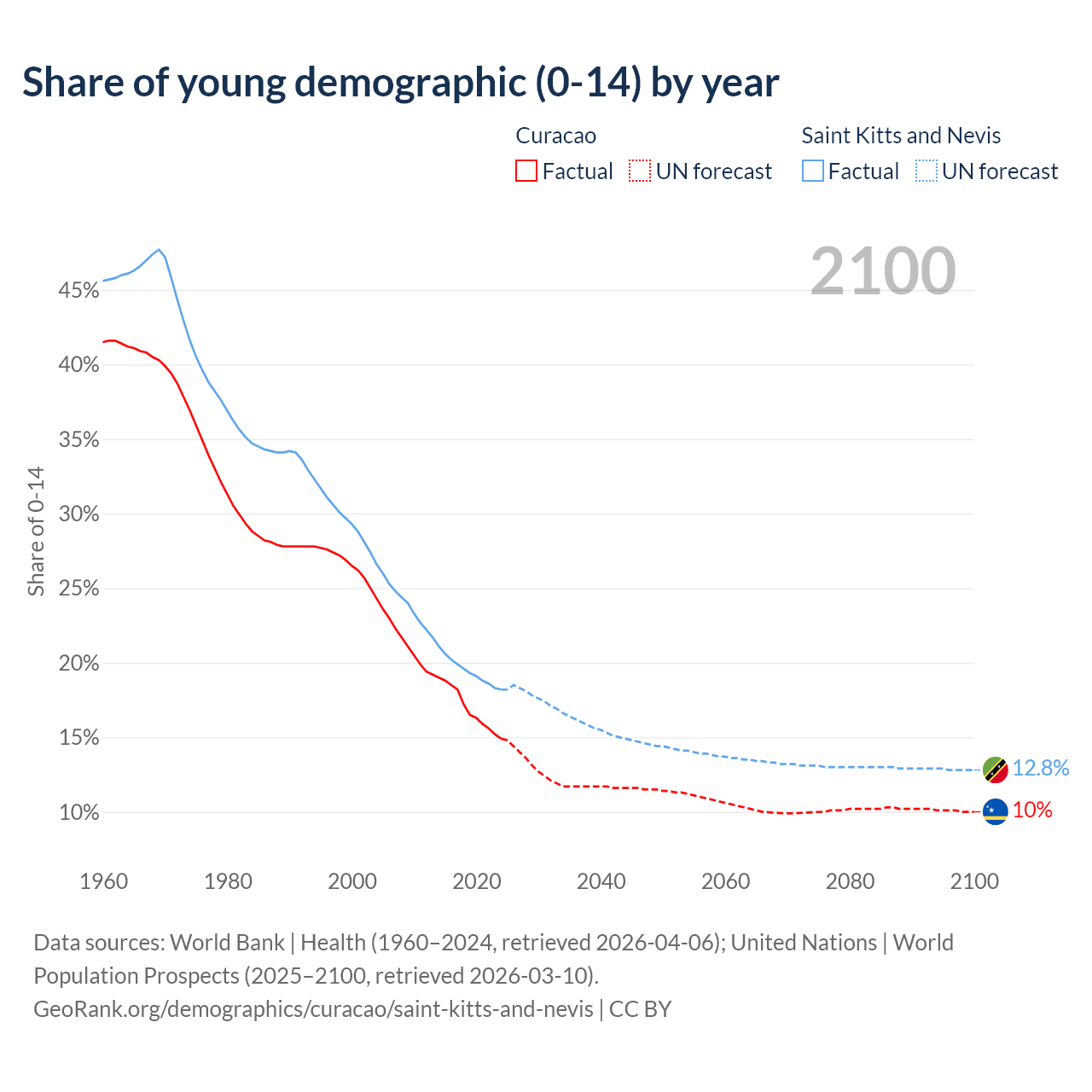 - The share of young demographic (0-15 years old) in Curacao is 14.9% vs 18.2% in Saint Kitts and Nevis.