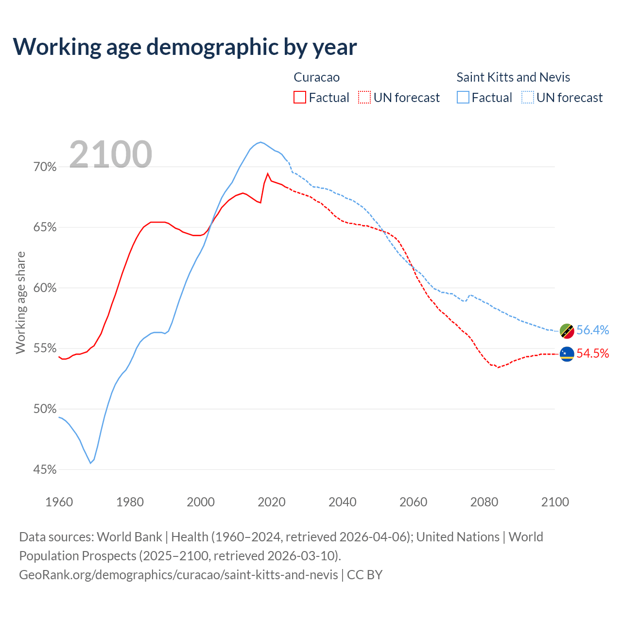 - Curacao has 107K working age adults (aged 15-64) vs 33.2K in Saint Kitts and Nevis.