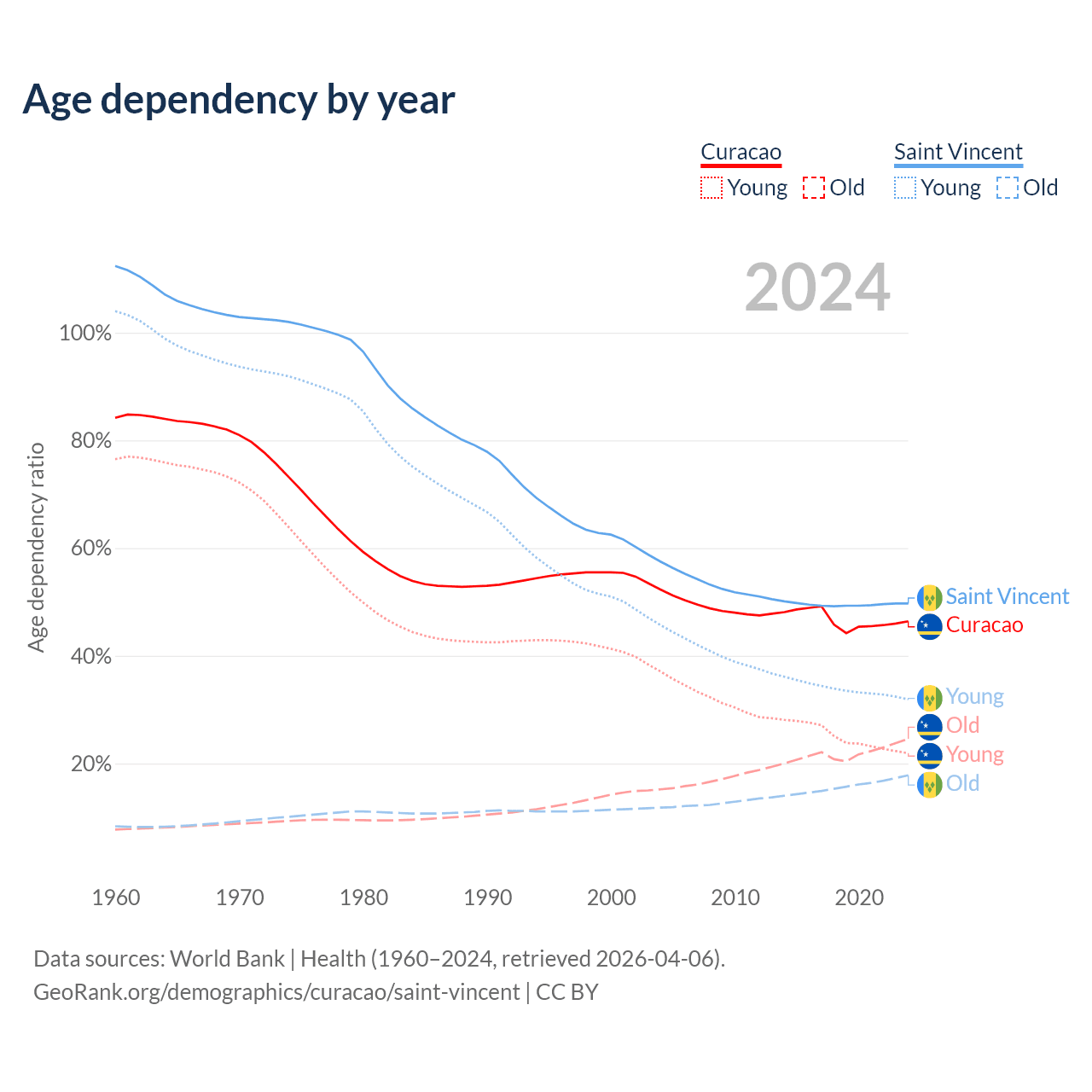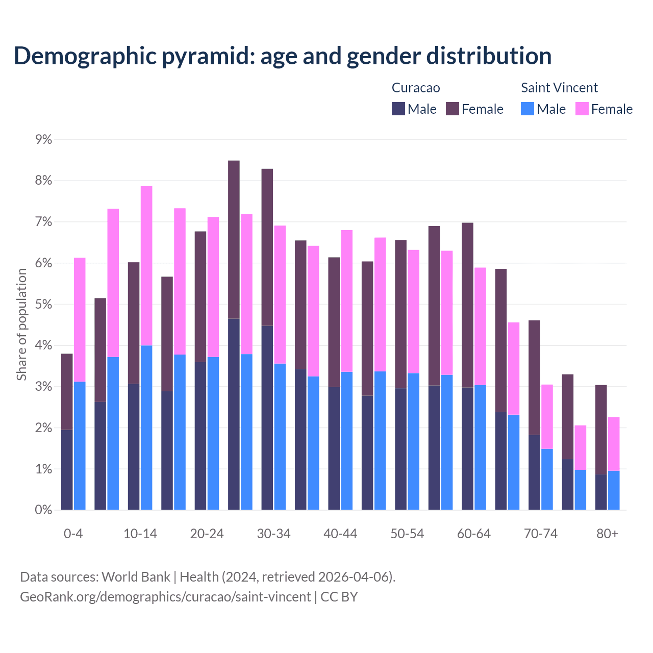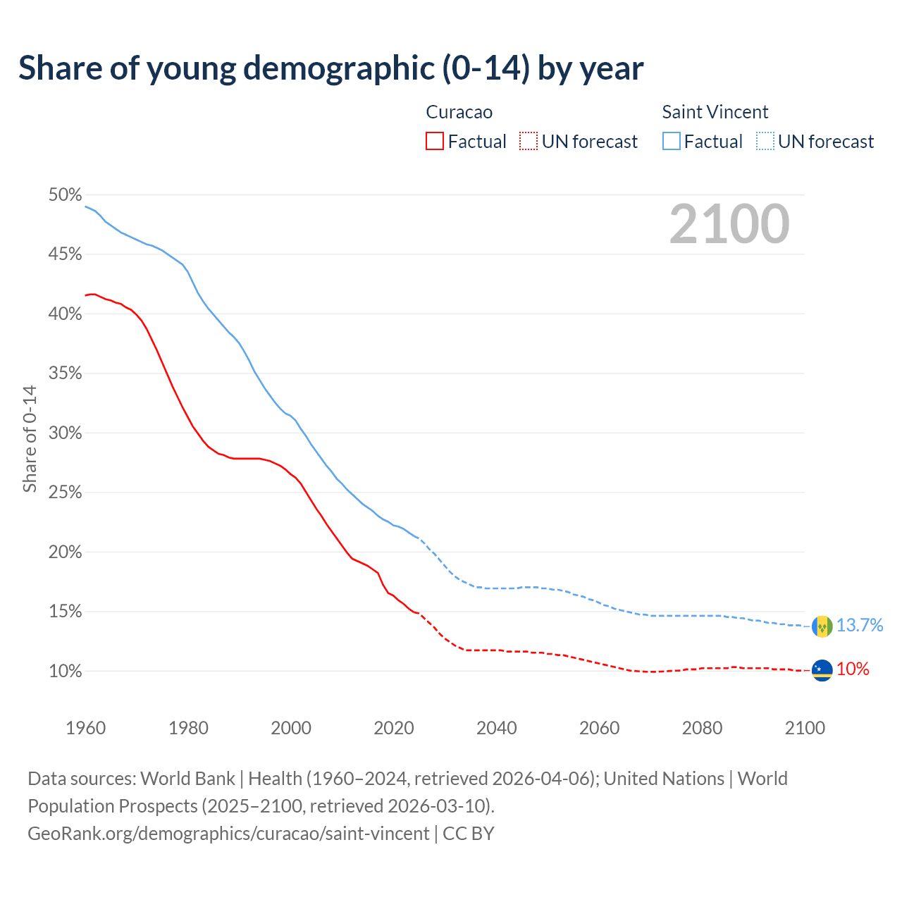 - The share of young demographic (0-15 years old) in Curacao is 14.9% vs 21.3% in Saint Vincent.