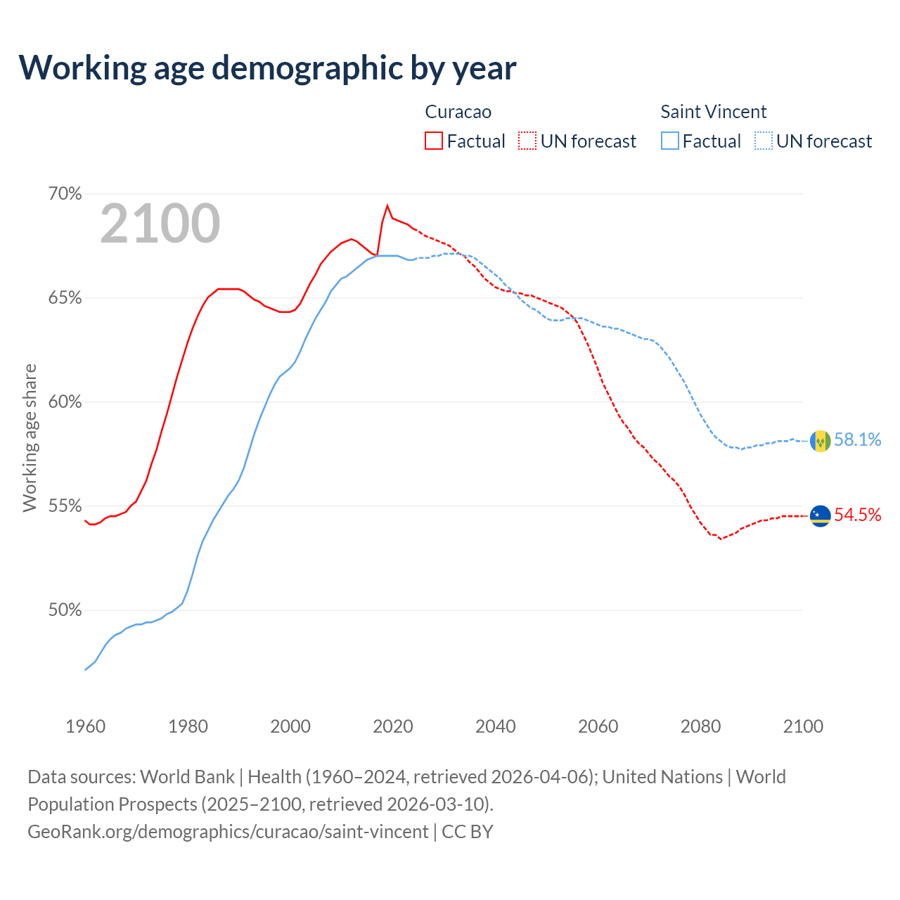 - Curacao has 107K working age adults (aged 15-64) vs 66.3K in Saint Vincent.
