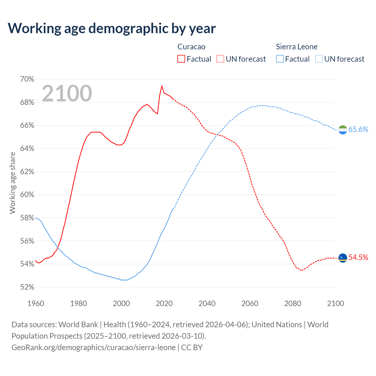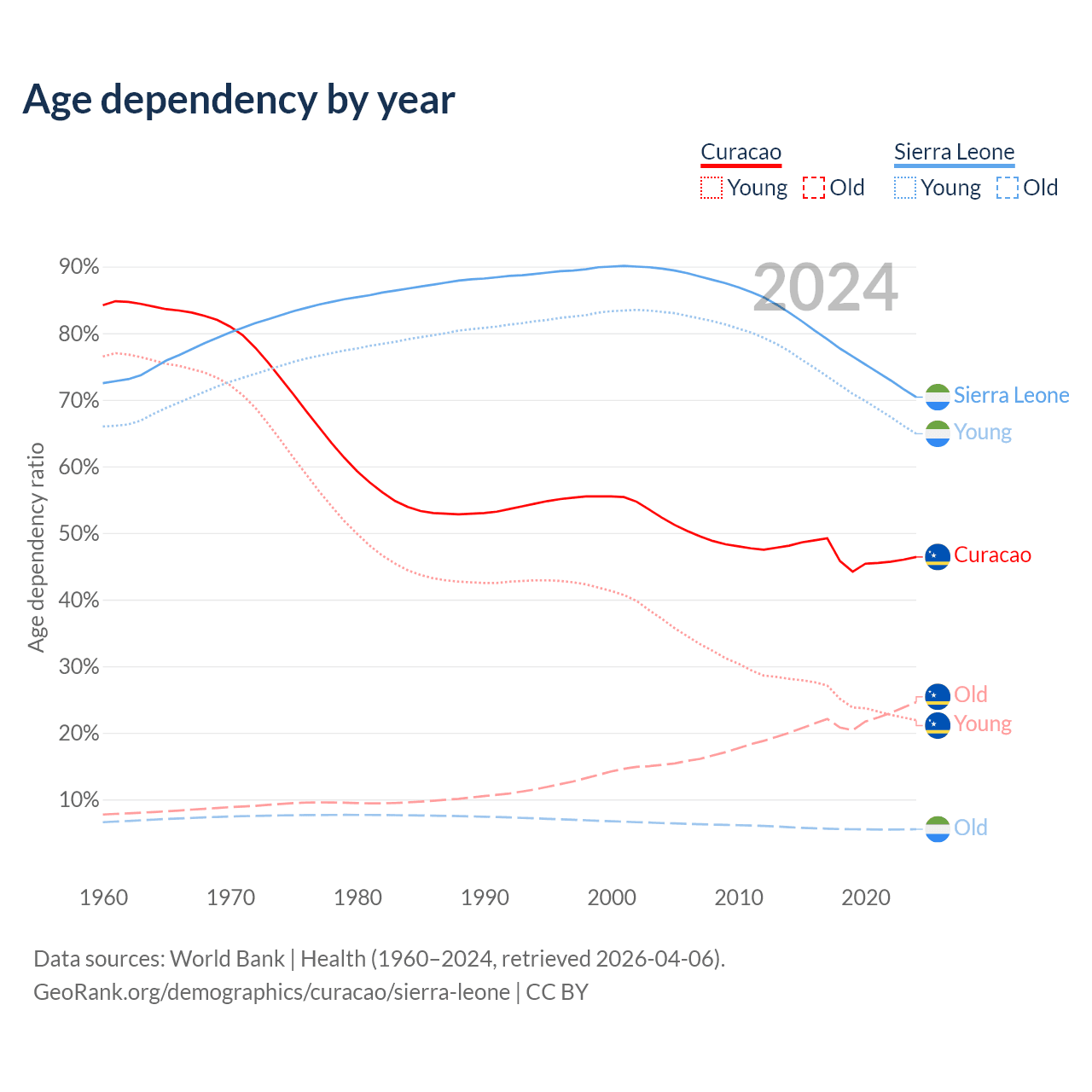 - The share of old-age demographic (65+) in Curacao is 16.8% vs 3.24% in Sierra Leone.