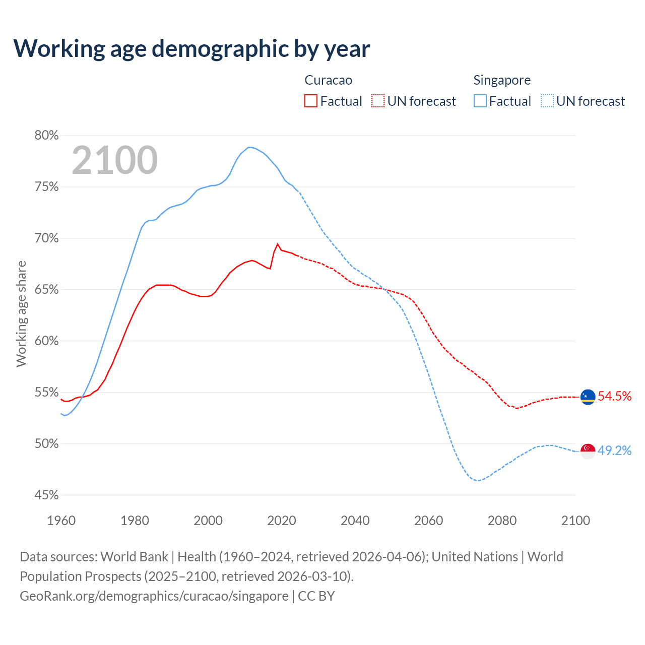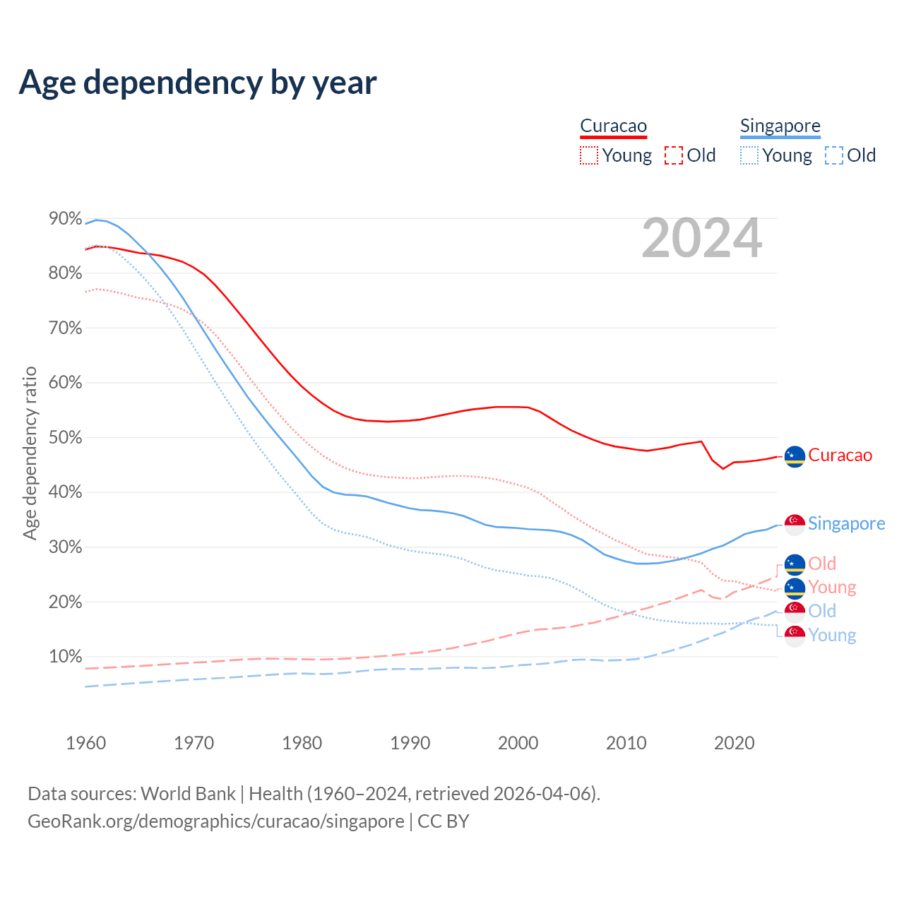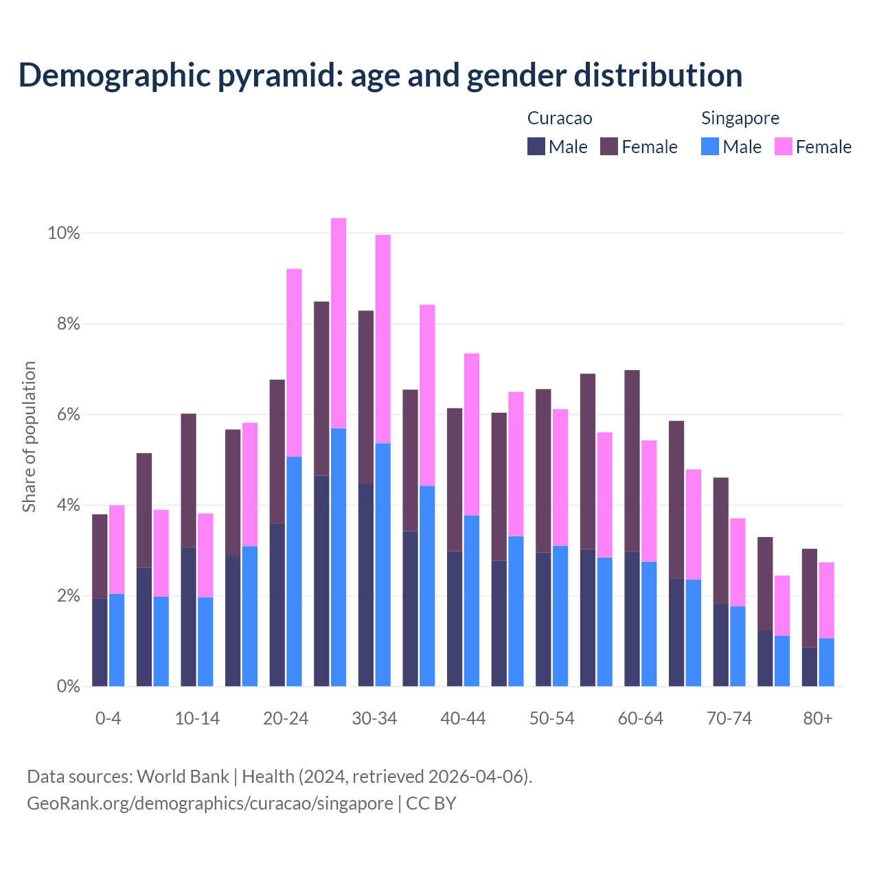 - Curacao is ranked 49/196 by median age (oldest to youngest) vs 68/196 for Singapore.