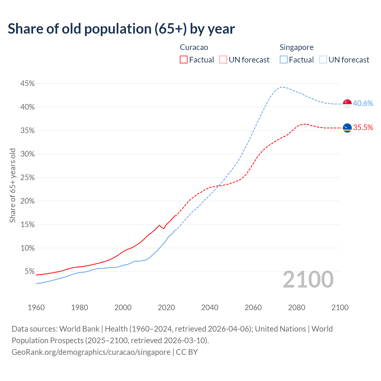 The share of older people aged 65 and over is 16.8% in Curacao and 13.7% in Singapore. Life expectancy in Curacao compared to Singapore .