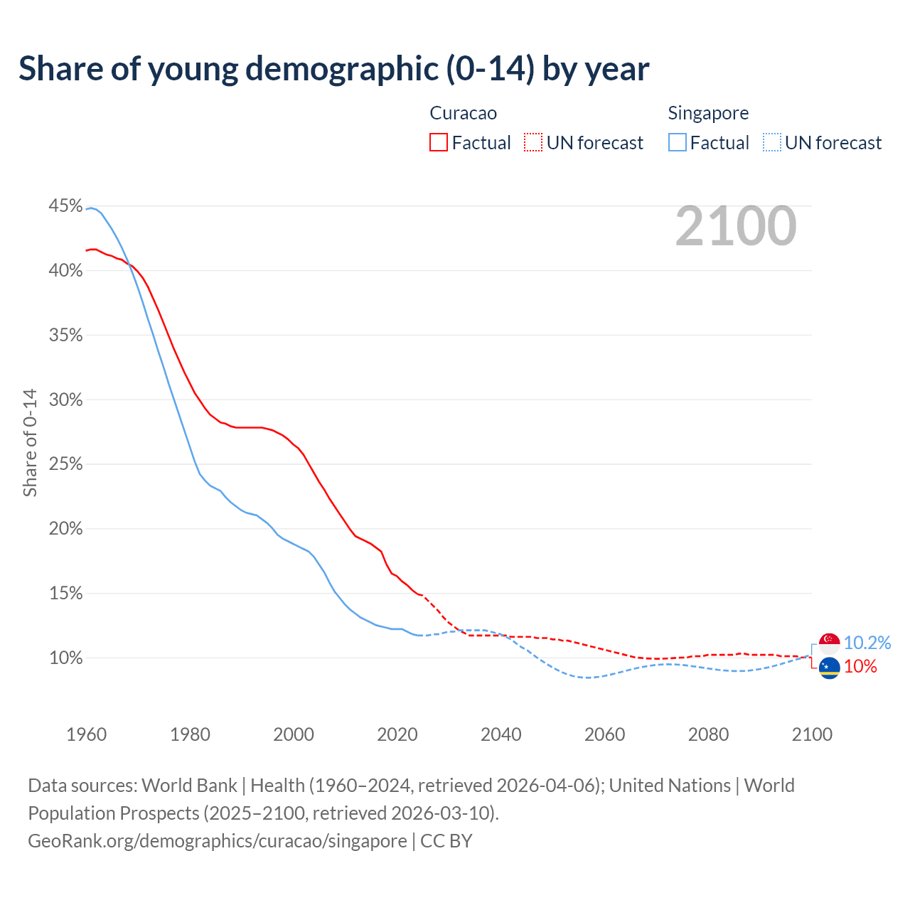 - The share of young demographic (0-15 years old) in Curacao is 14.9% vs 11.7% in Singapore.