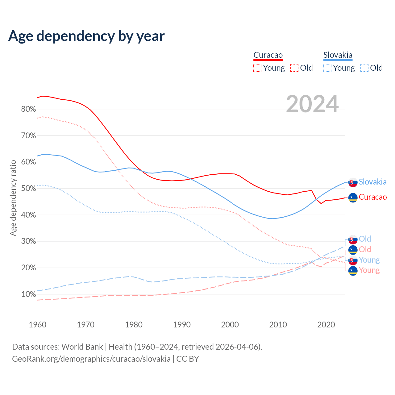The share of older people aged 65 and over is 16.8% in Curacao and 18.5% in Slovakia. Life expectancy in Curacao compared to Slovakia .