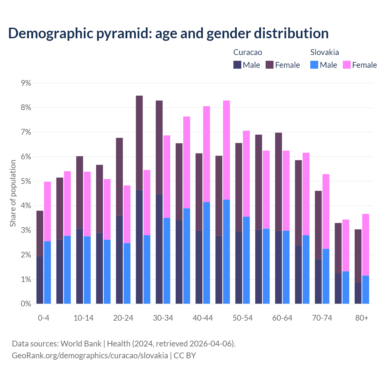 - The share of old-age demographic (65+) in Curacao is 16.8% vs 18.5% in Slovakia.