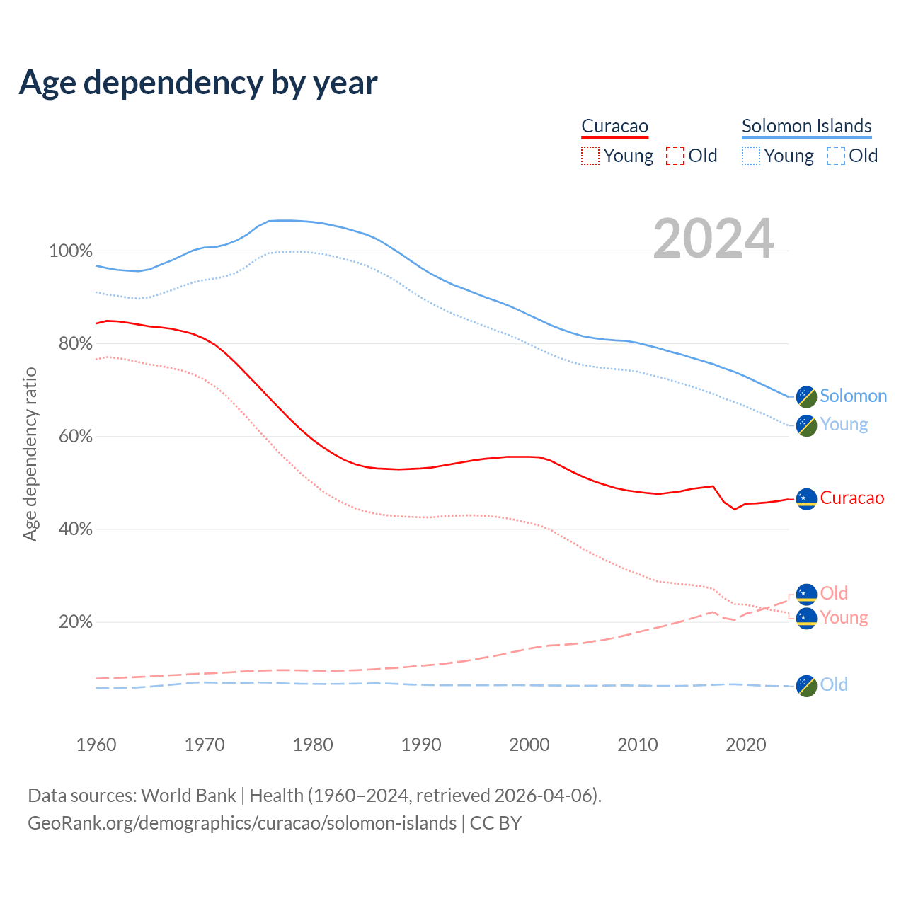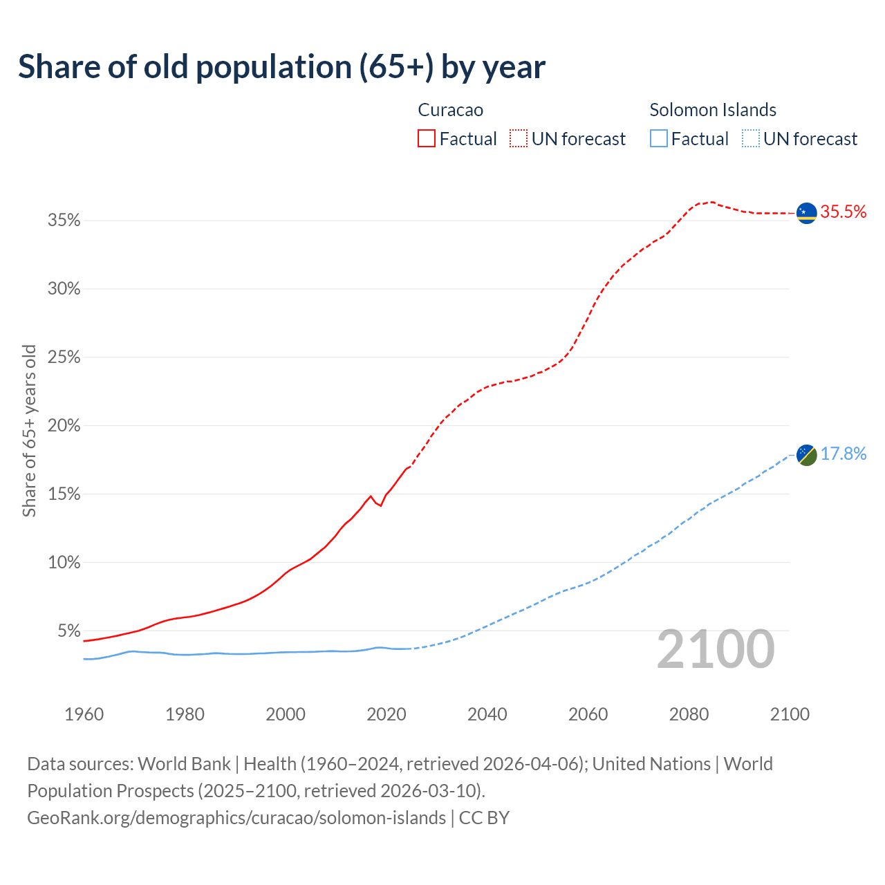 - The share of old-age demographic (65+) in Curacao is 16.8% vs 3.64% in the Solomon Islands.
