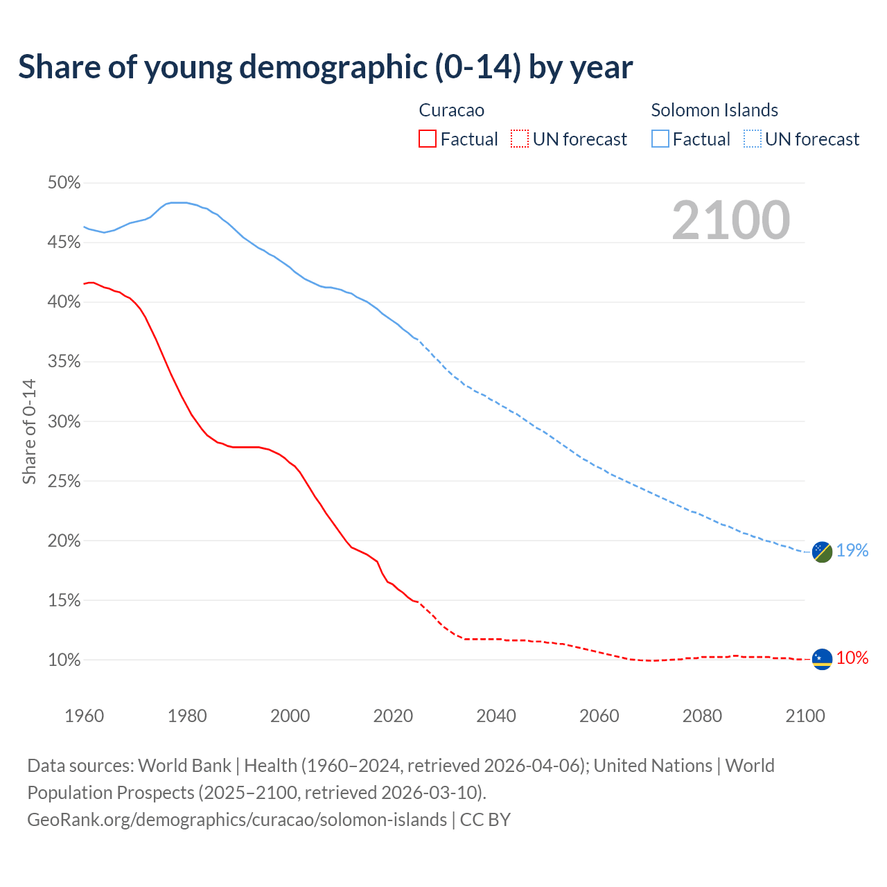 - The share of young demographic (0-15 years old) in Curacao is 14.9% vs 37% in the Solomon Islands.