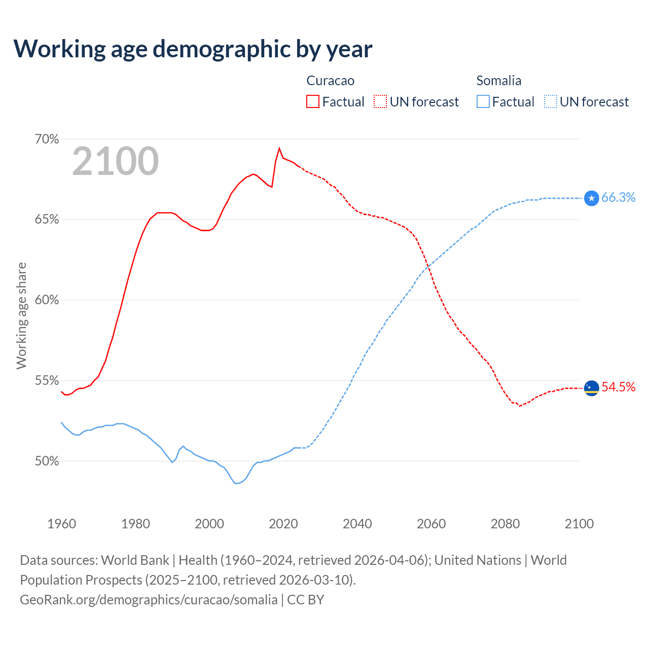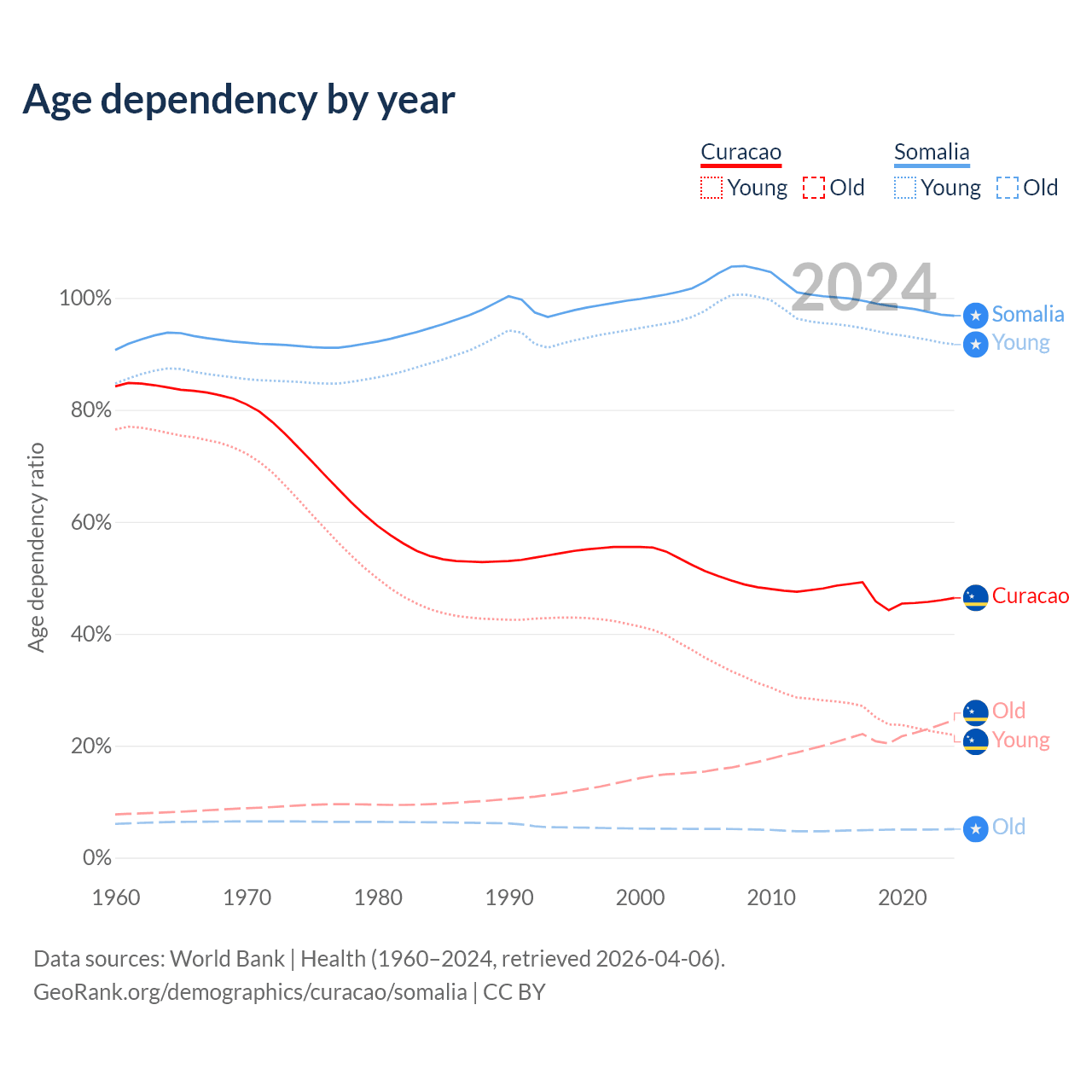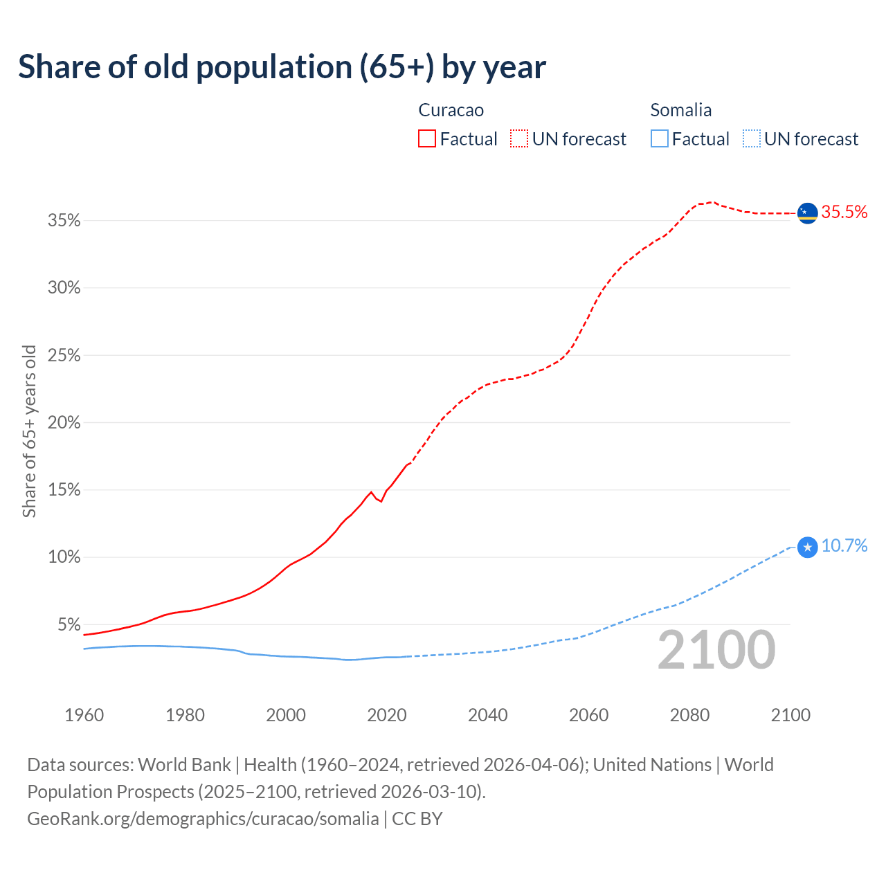 - The share of old-age demographic (65+) in Curacao is 16.8% vs 2.59% in Somalia.