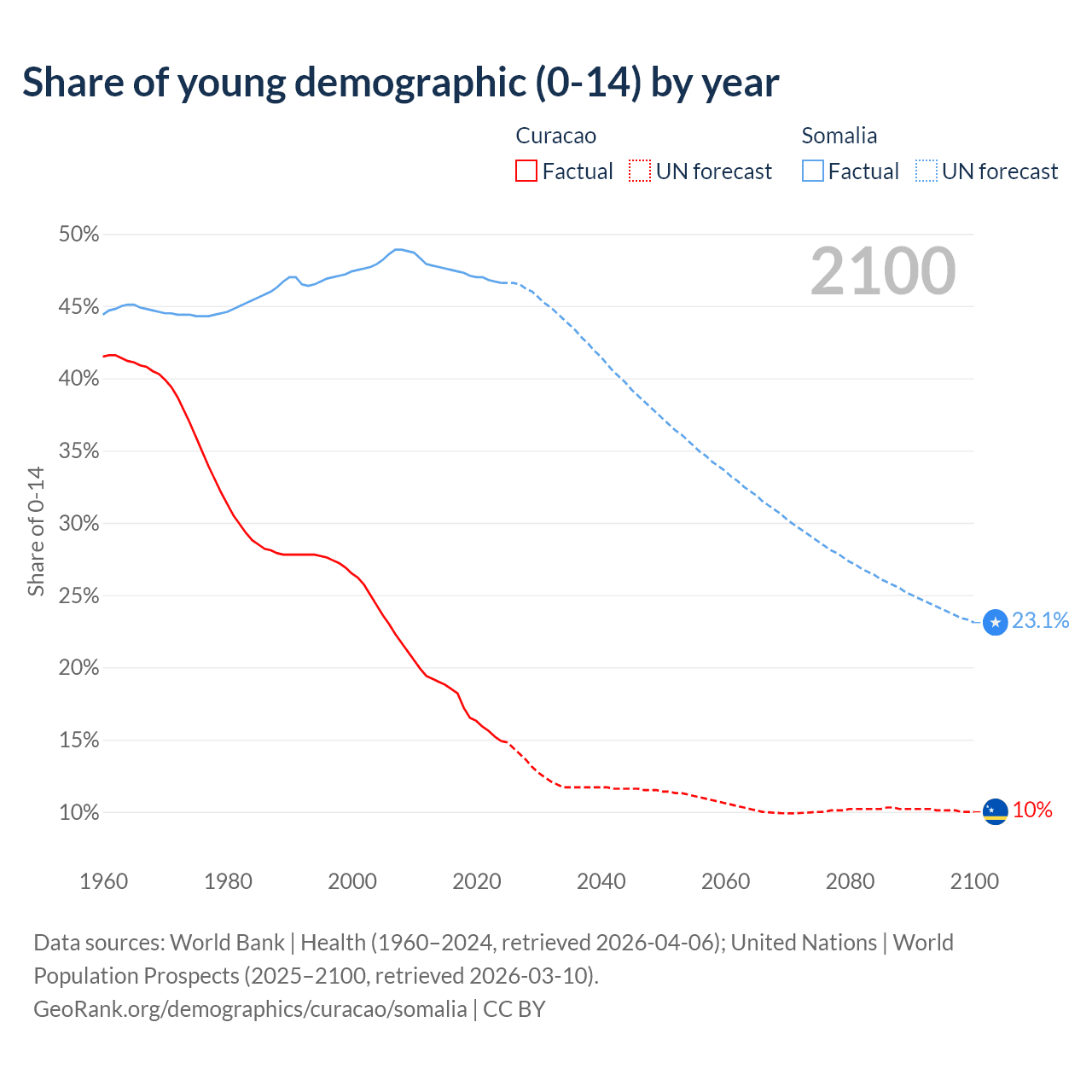 - The share of young demographic (0-15 years old) in Curacao is 14.9% vs 46.6% in Somalia.