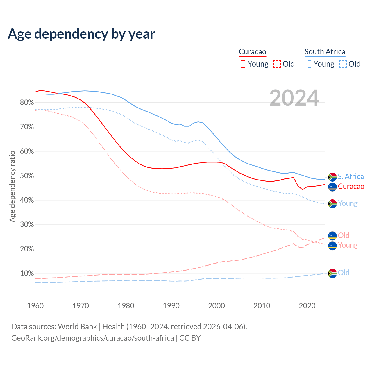 The share of older people aged 65 and over is 16.8% in Curacao and 6.69% in South Africa. Life expectancy in Curacao compared to South Africa .