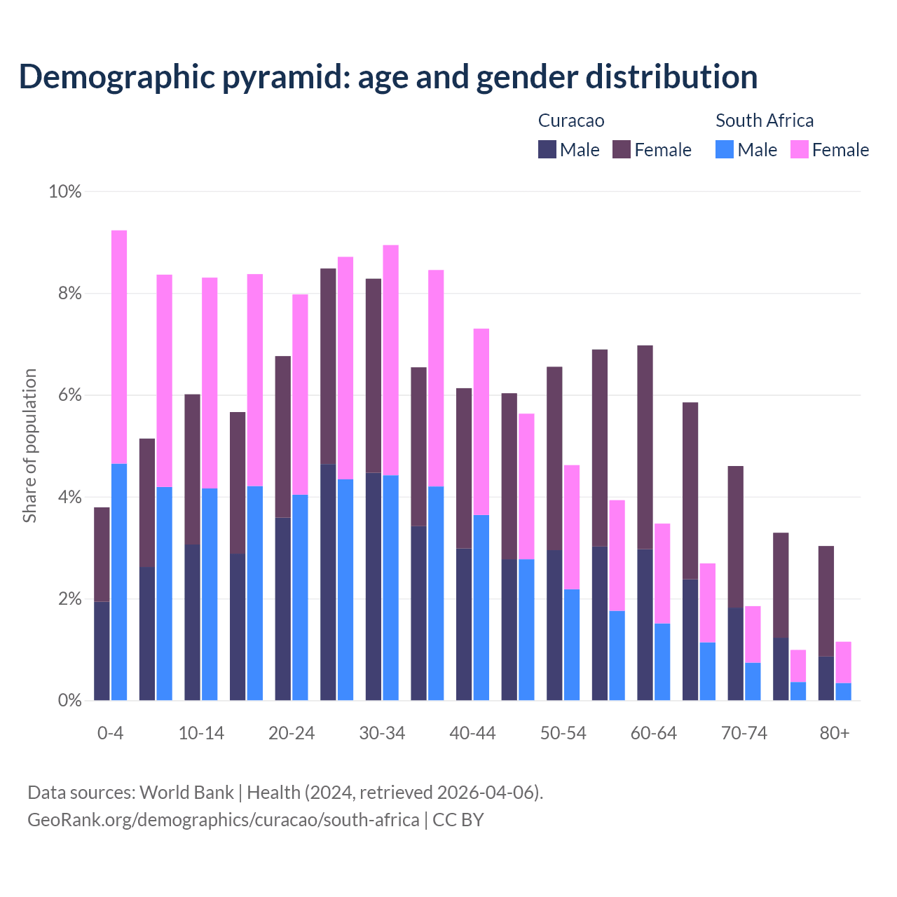 - The share of old-age demographic (65+) in Curacao is 16.8% vs 6.69% in South Africa.