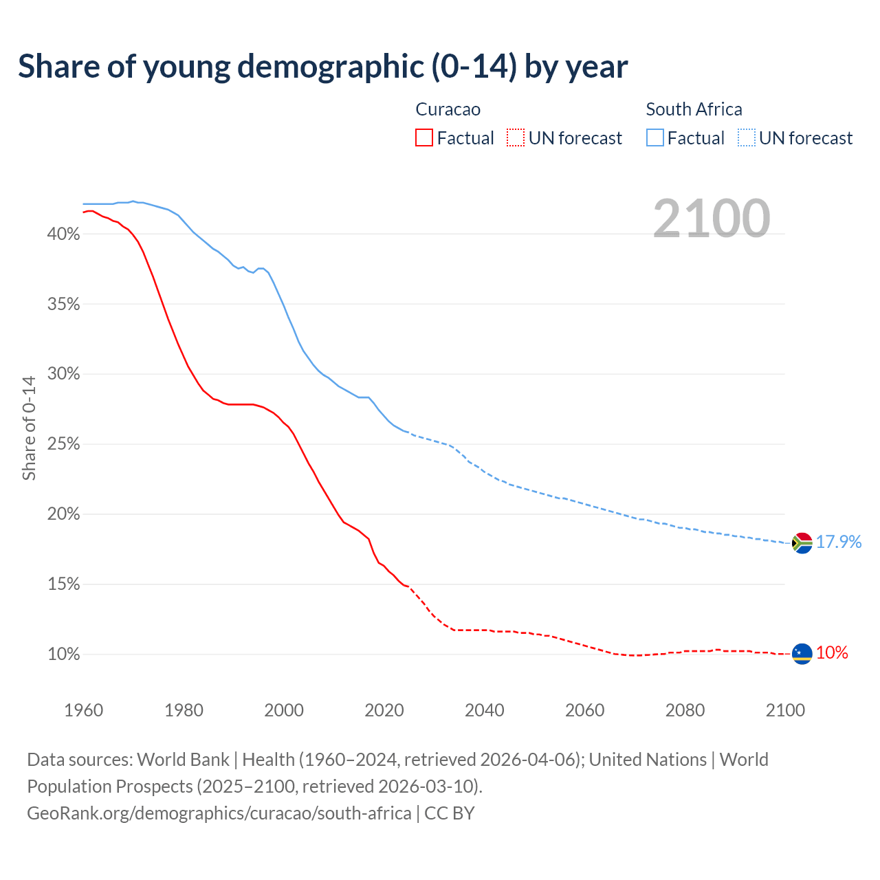 - The share of young demographic (0-15 years old) in Curacao is 14.9% vs 25.9% in South Africa.