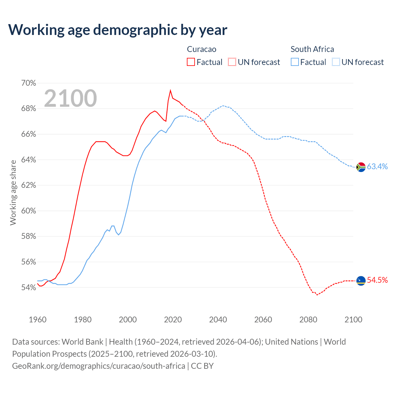 Median age Curacao vs South Africa, 1960-2100