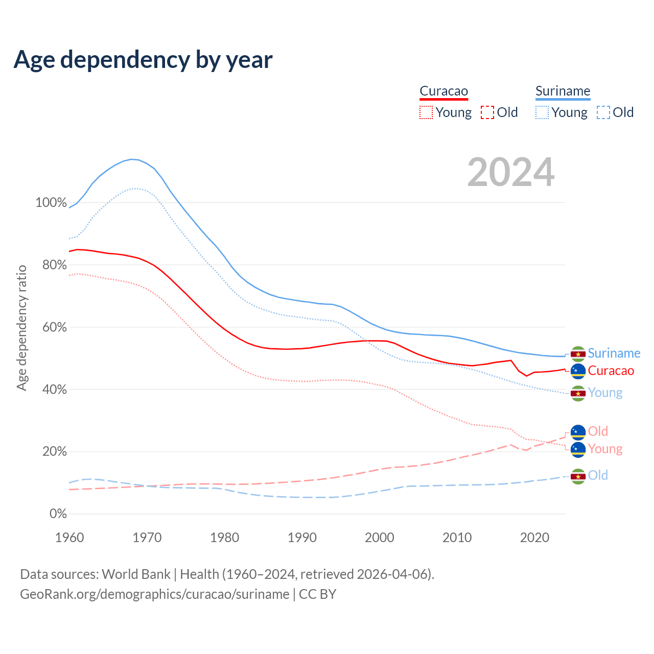 - Curacao is ranked 49/196 by median age (oldest to youngest) vs 109/196 for Suriname.