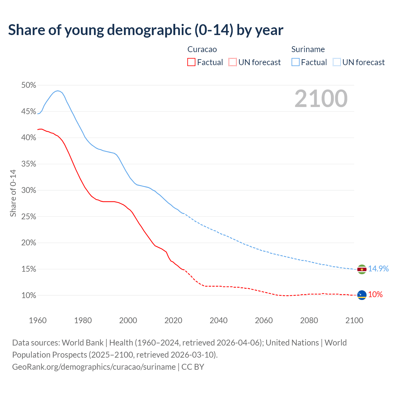 - The share of young demographic (0-15 years old) in Curacao is 14.9% vs 25.6% in Suriname.
