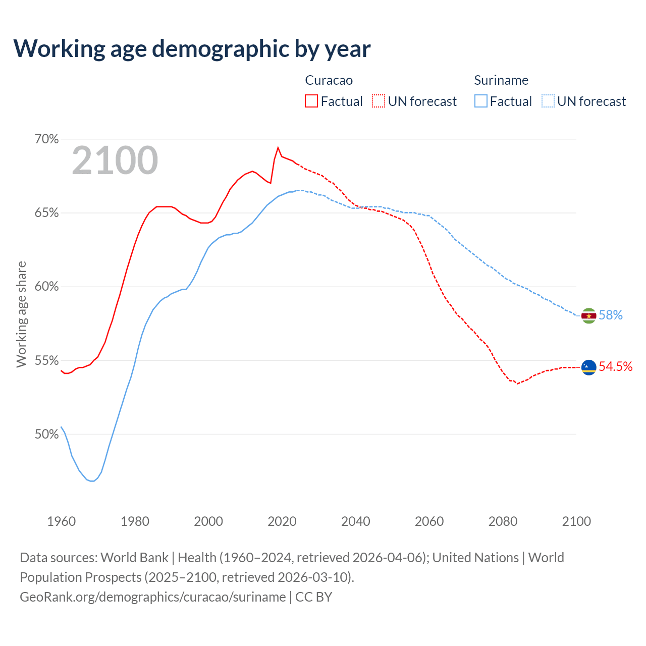 - Curacao has 107K working age adults (aged 15-64) vs 430K in Suriname.