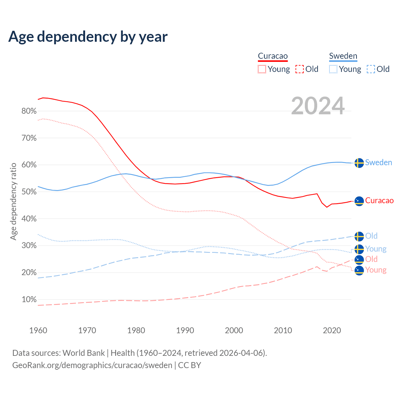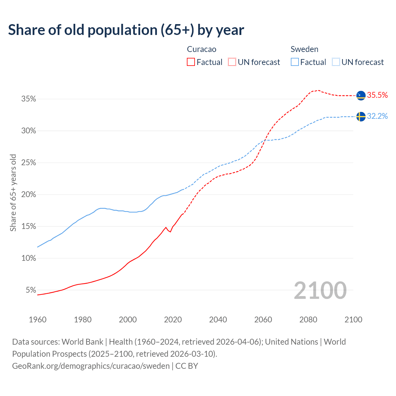 - The share of old-age demographic (65+) in Curacao is 16.8% vs 20.7% in Sweden.