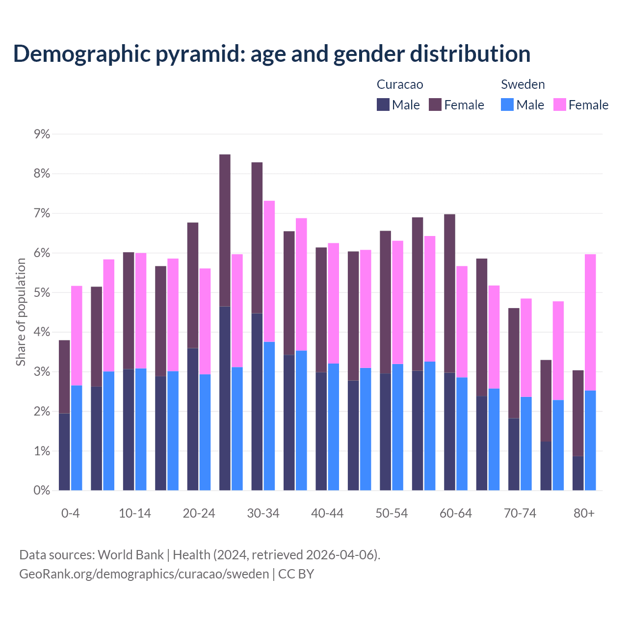 - Curacao is ranked 49/196 by median age (oldest to youngest) vs 39/196 for Sweden.