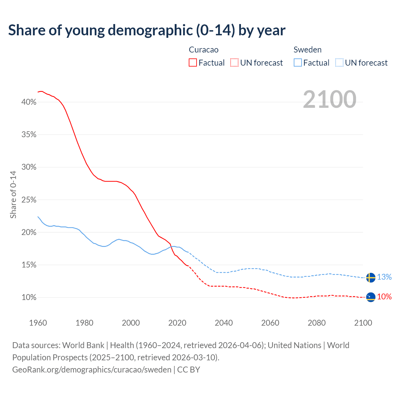 - The share of young demographic (0-15 years old) in Curacao is 14.9% vs 17% in Sweden.