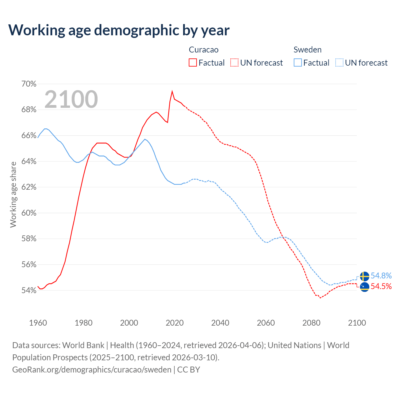 - Curacao has 107K working age adults (aged 15-64) vs 6.65M in Sweden.