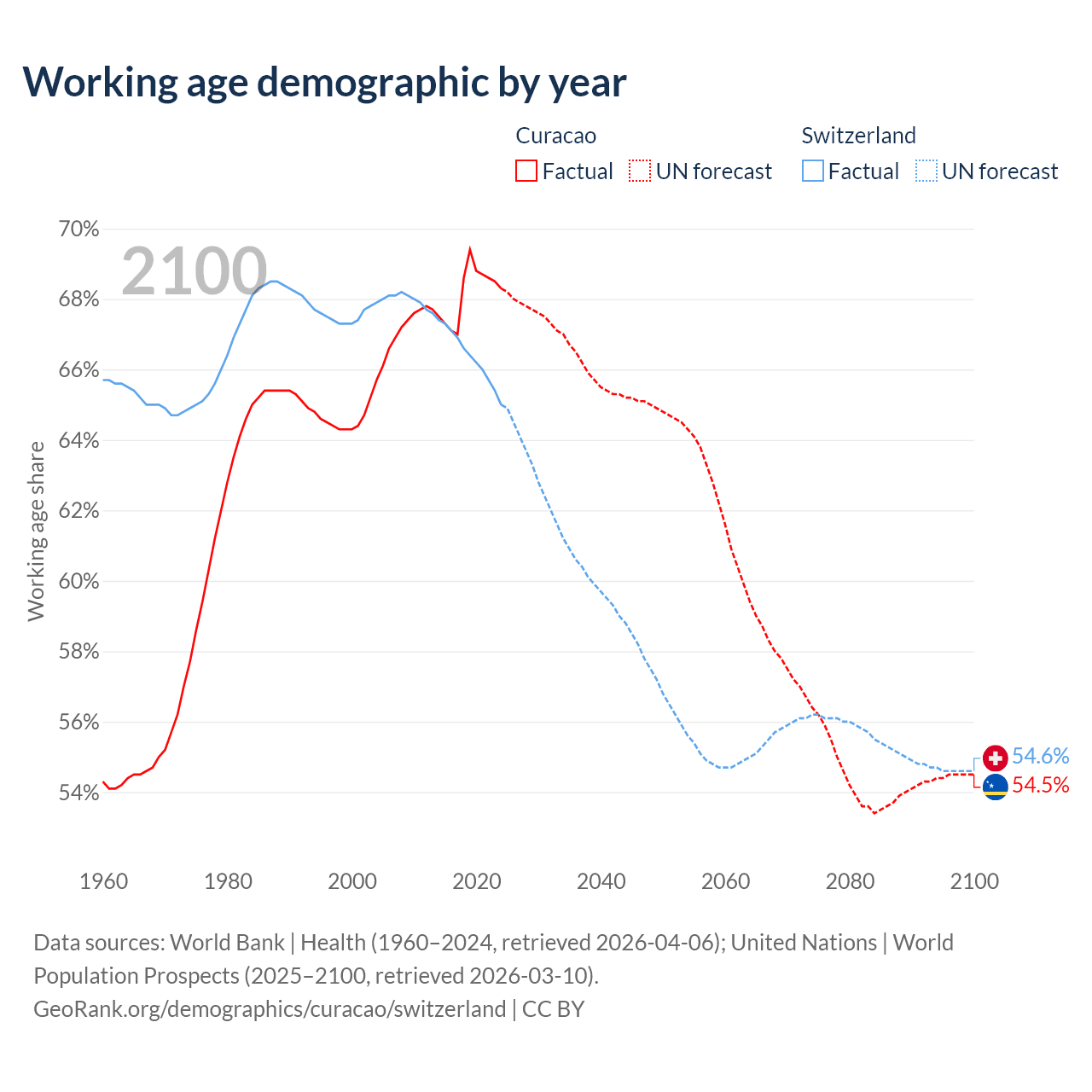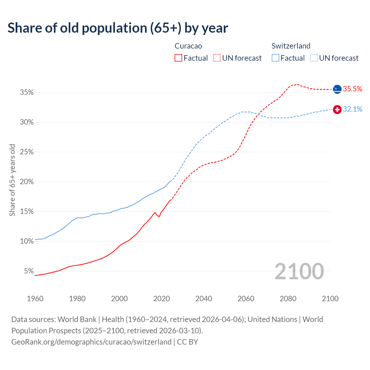 Median age Curacao vs Switzerland, 1960-2100