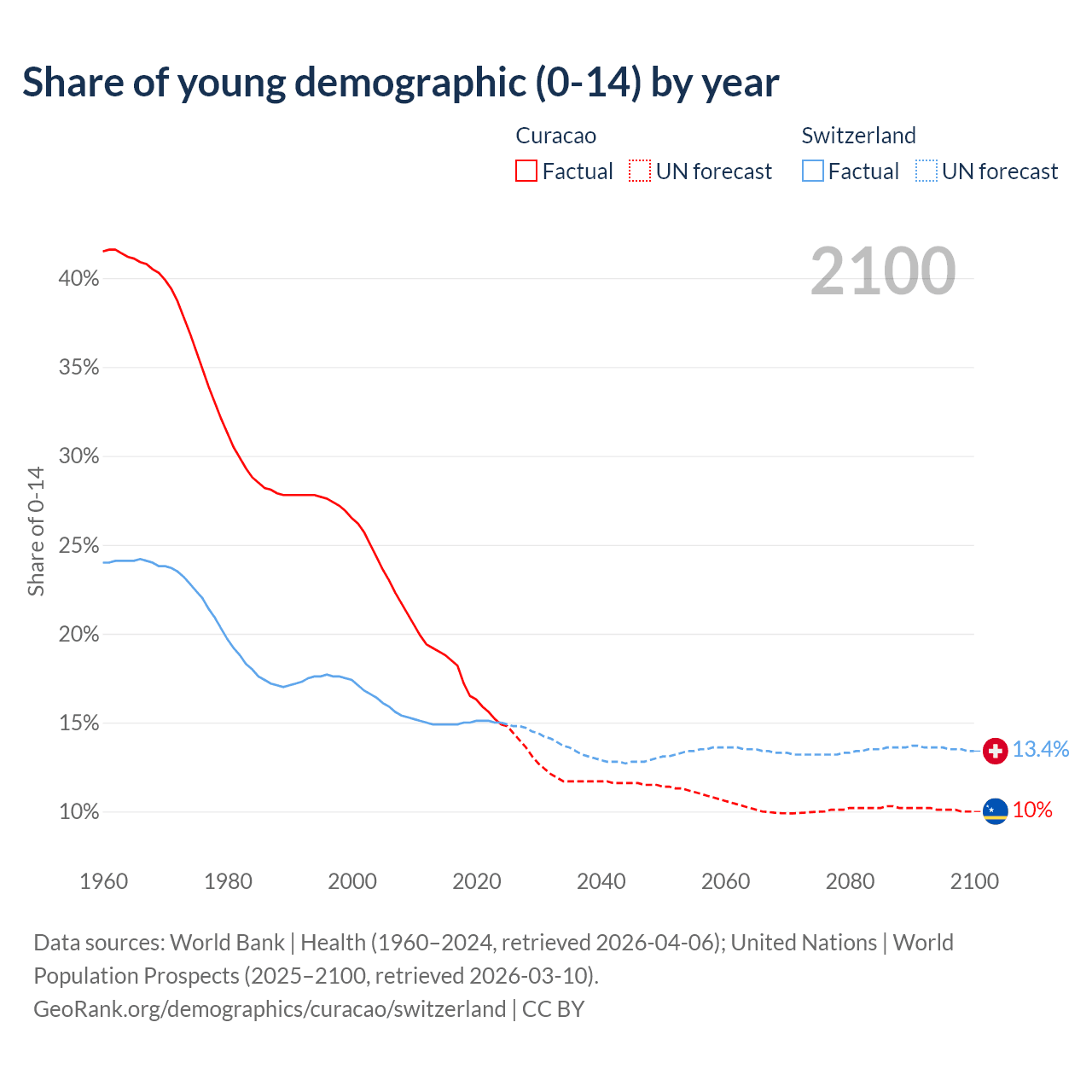 - The share of young demographic (0-15 years old) in Curacao is 14.9% vs 15% in Switzerland.