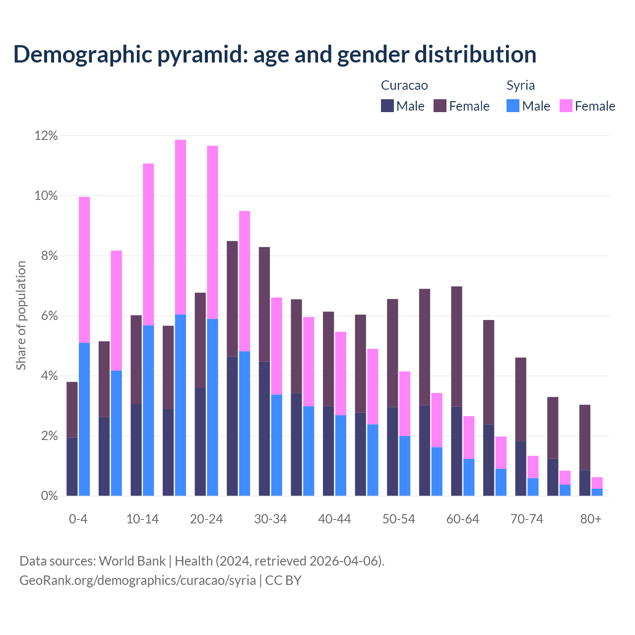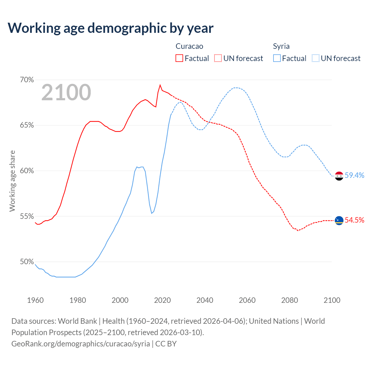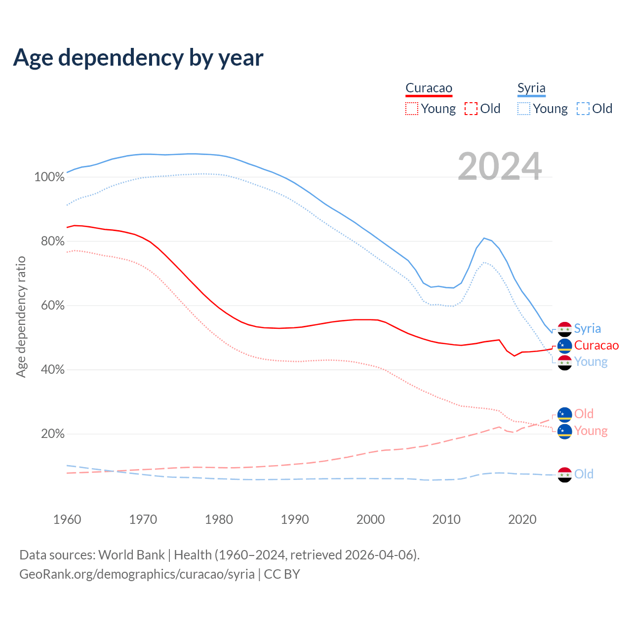 - The share of old-age demographic (65+) in Curacao is 16.8% vs 4.74% in Syria.