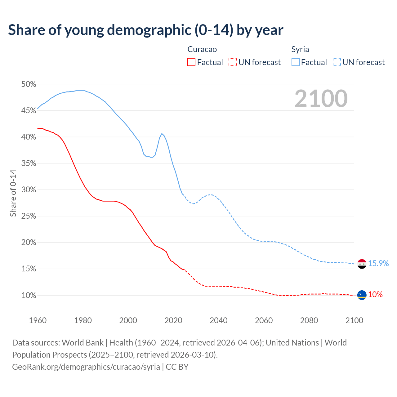- The share of young demographic (0-15 years old) in Curacao is 14.9% vs 29.2% in Syria.