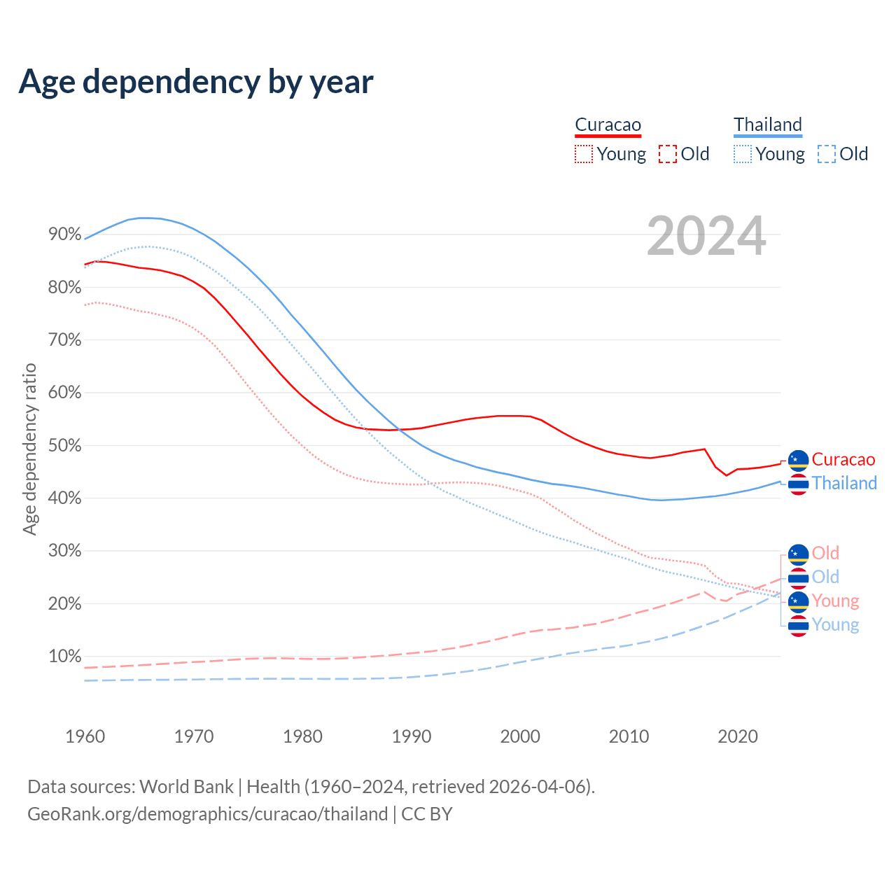 - The share of old-age demographic (65+) in Curacao is 16.8% vs 15.4% in Thailand.