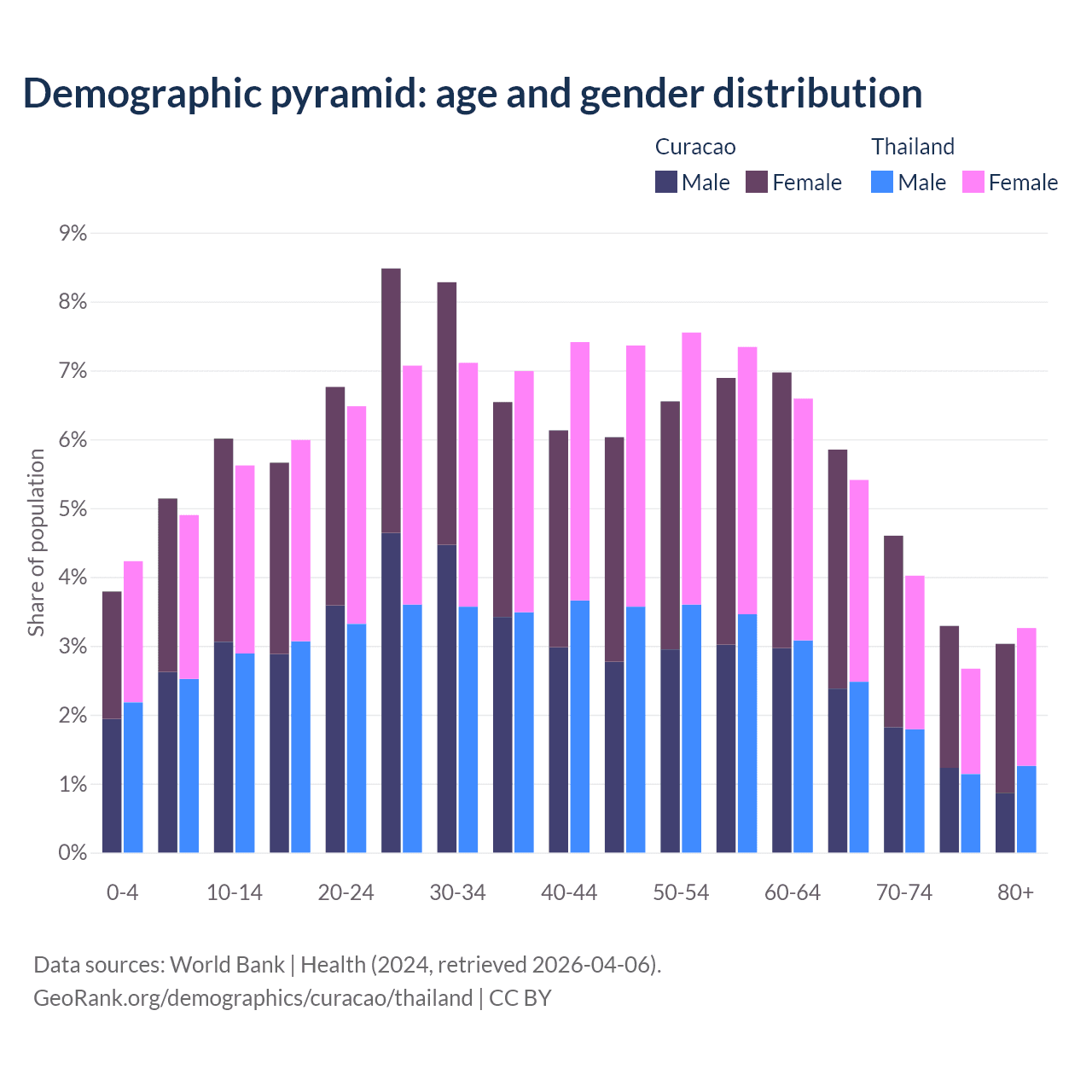 - Curacao is ranked 49/196 by median age (oldest to youngest) vs 40/196 for Thailand.