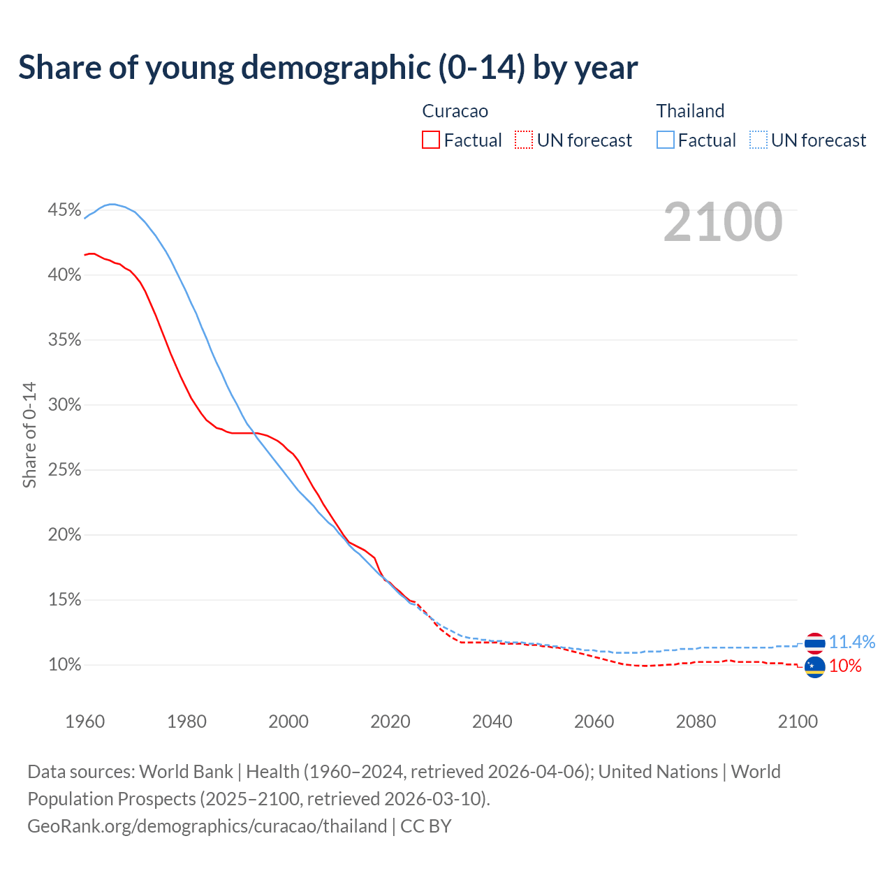 - The share of young demographic (0-15 years old) in Curacao is 14.9% vs 14.7% in Thailand.