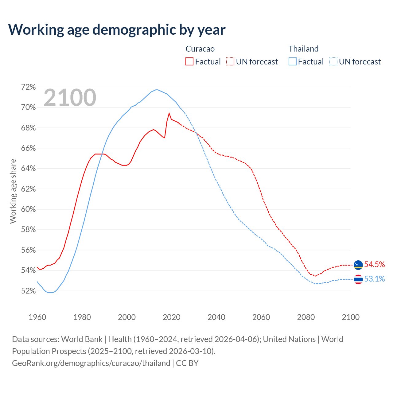 Median age Curacao vs Thailand, 1960-2100